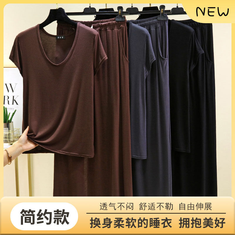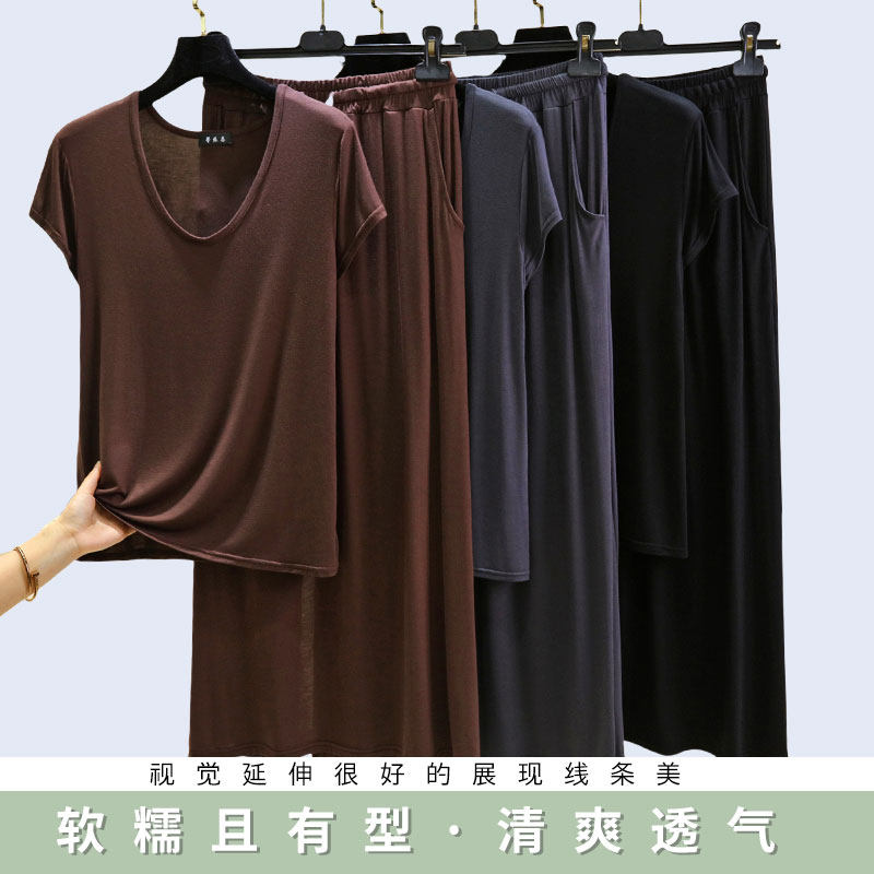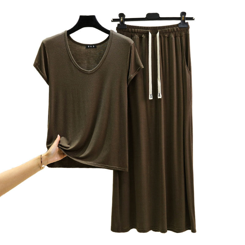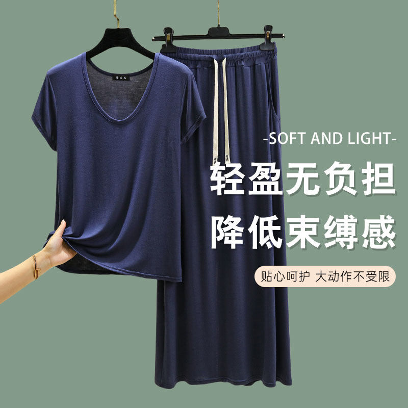 莫代尔上衣拖地长裙两件套女夏季可外穿家居服短袖T恤半身裙套装