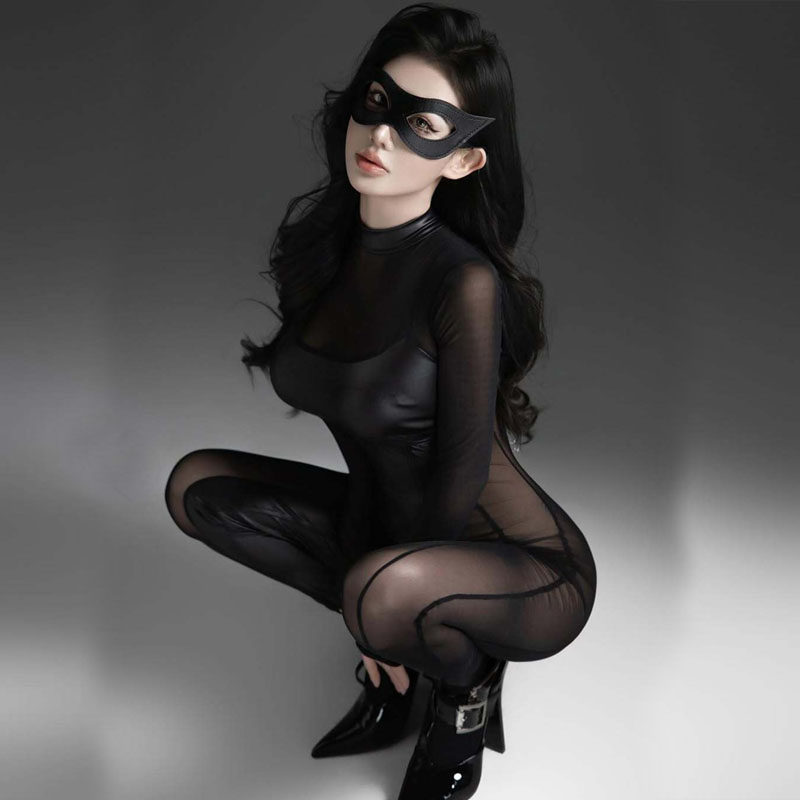 辣妹性感写真拍照猫女连体皮衣cos角色扮演制服夜店酒吧透视漆皮