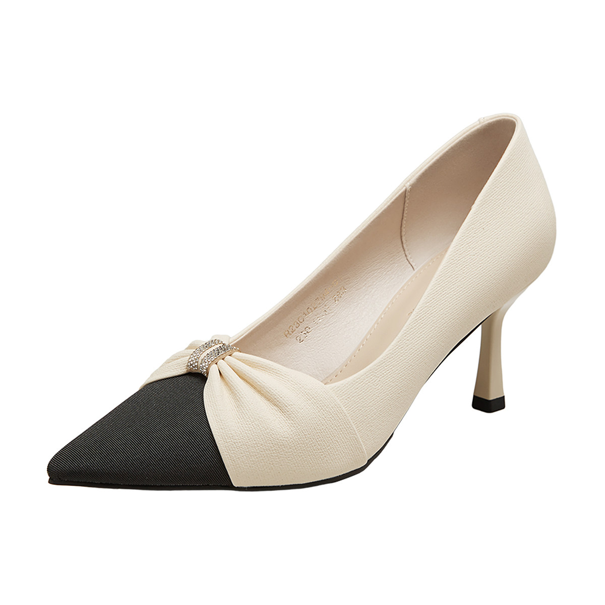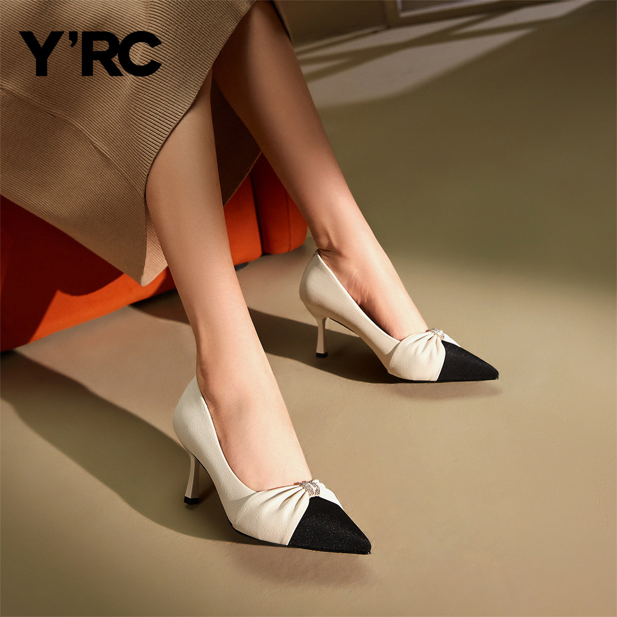 YRC尖头高跟鞋女新款春秋通勤时尚法式复古蝴蝶结细跟单鞋