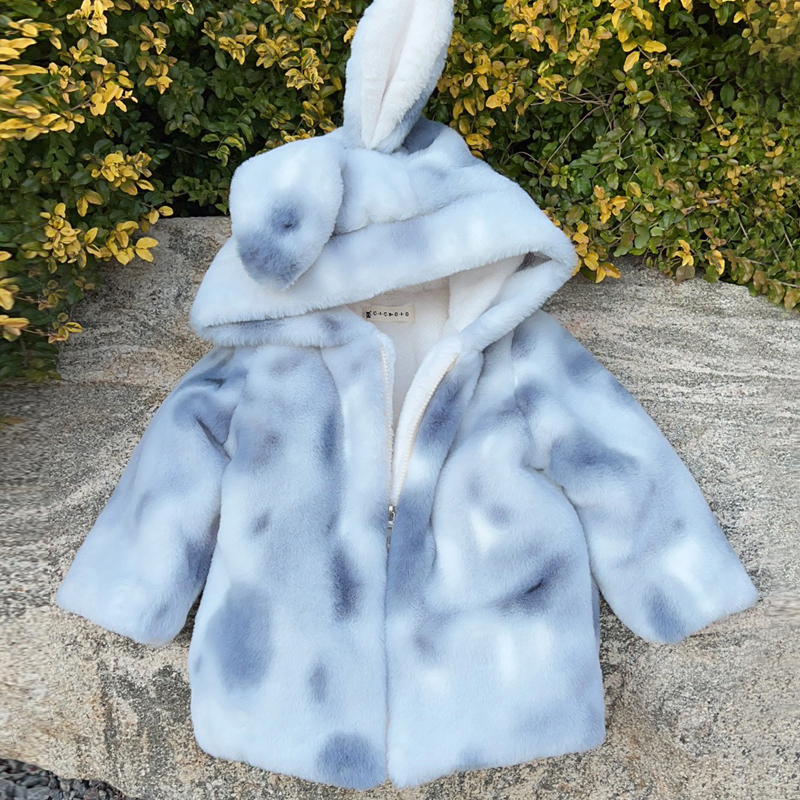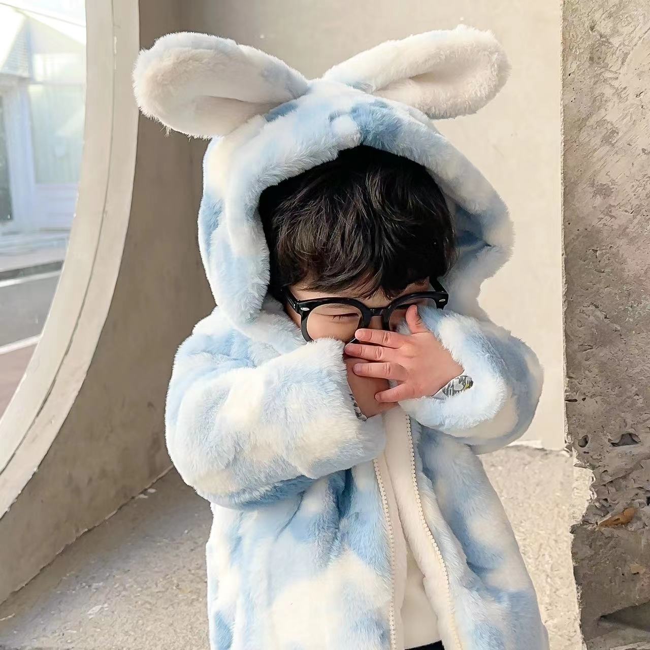 男童女童仿皮草加厚绒外套宝宝棉衣连帽中长款小孩兔子过新年衣服