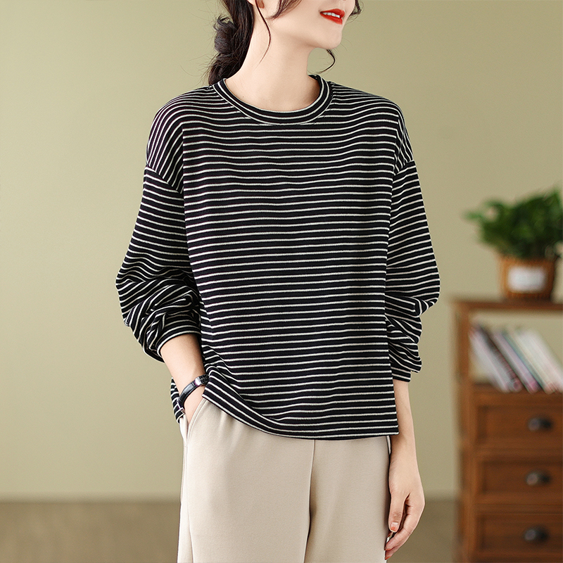 条纹长袖T恤女秋冬2025新款圆领宽松韩版内搭打底衫百搭上衣