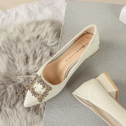粗跟单鞋女2024春秋新款百搭尖头中跟水钻浅口白色软底瓢鞋子