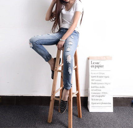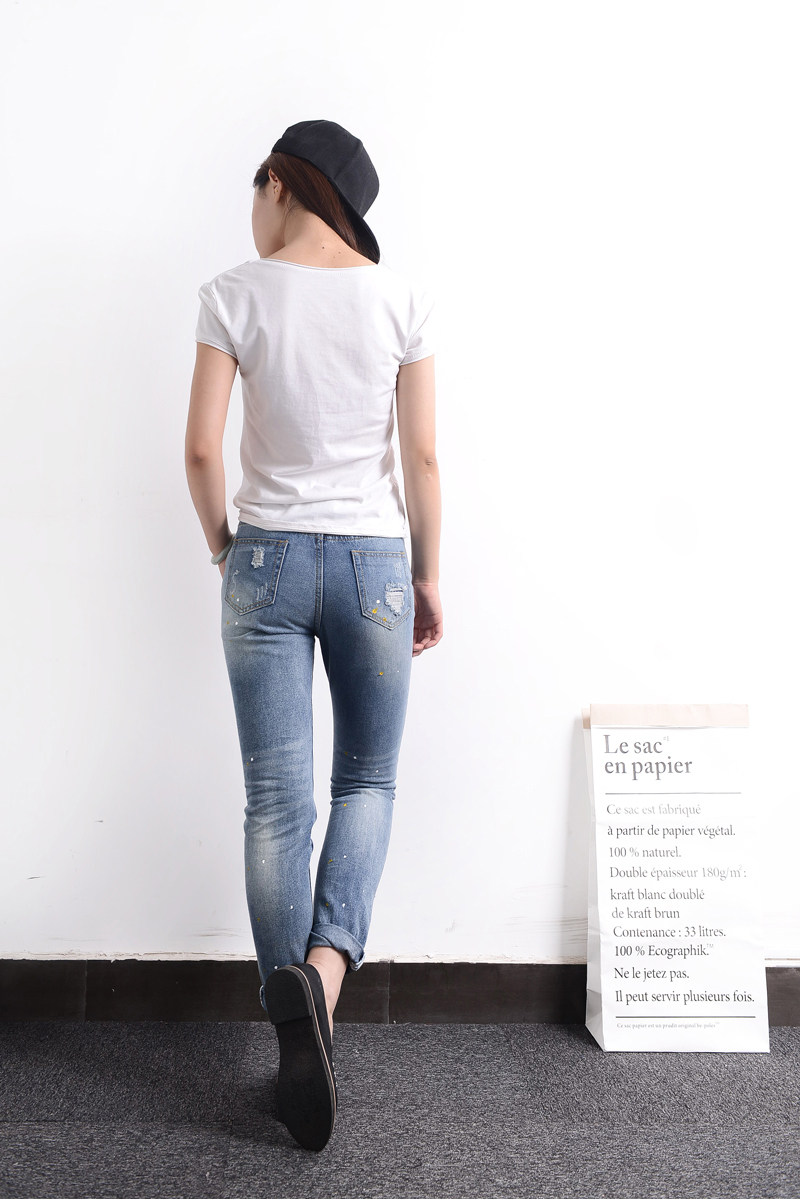 推荐款大破洞漆点女牛仔裤小直筒款长裤时尚潮款BF风抓纹浅蓝磨白