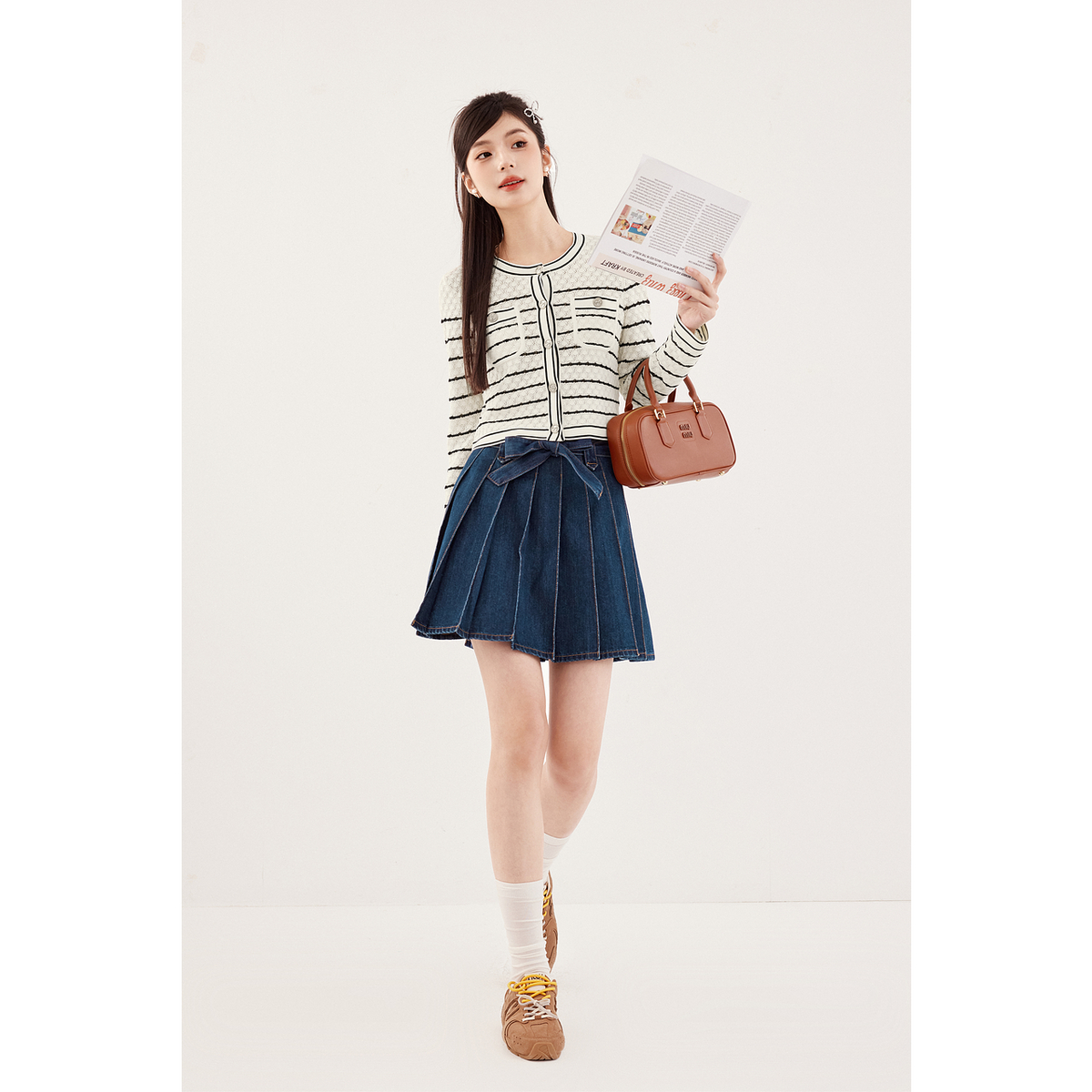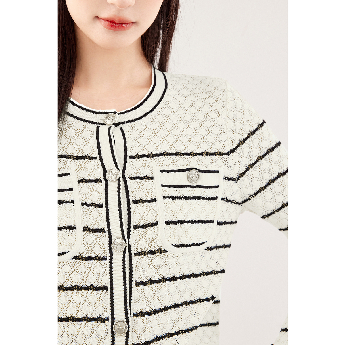诗凡黎截短款蝴蝶结纽扣小香风条纹开衫外套2024秋新款别致上衣女