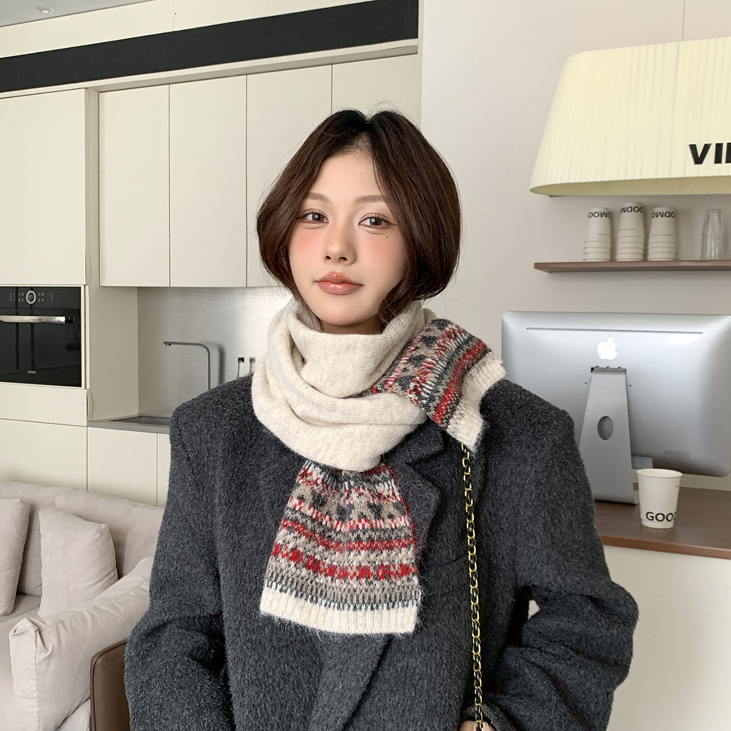 绿色针织毛线围巾女冬季韩系氛围感加厚百搭保暖防寒围脖费尔岛款