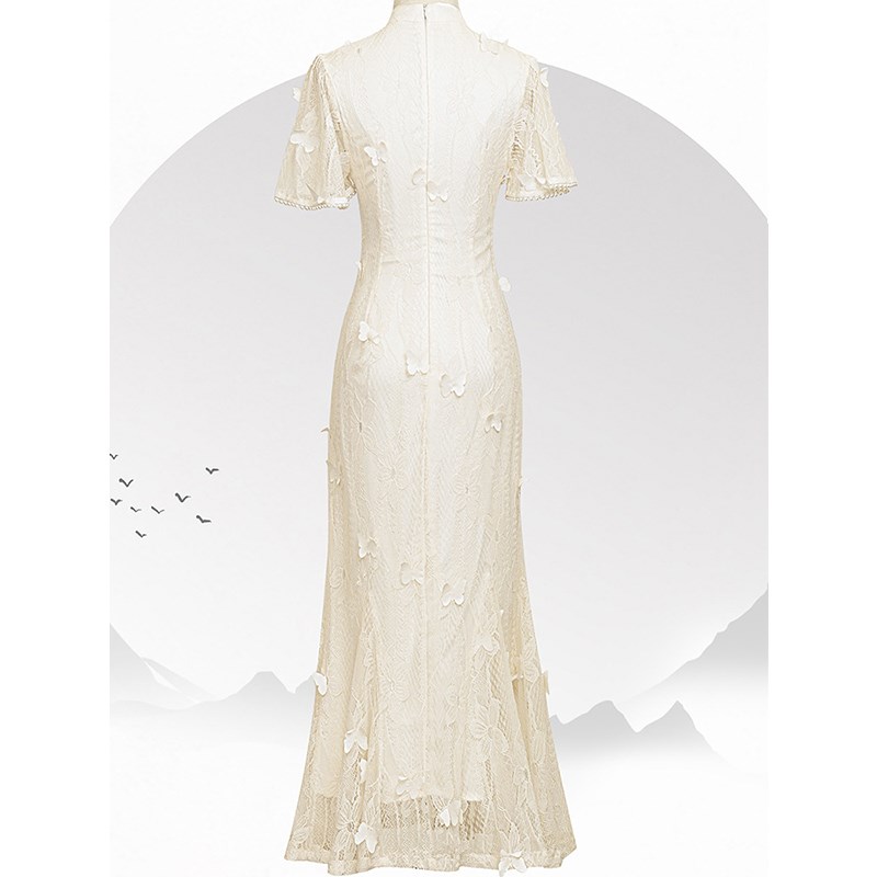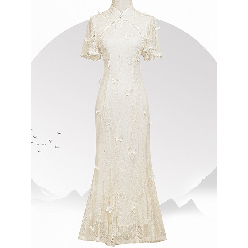 蕾丝镂空新中式鱼尾裙短袖夏新款棉旗袍中长款白色少女年轻连衣裙