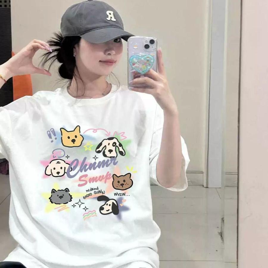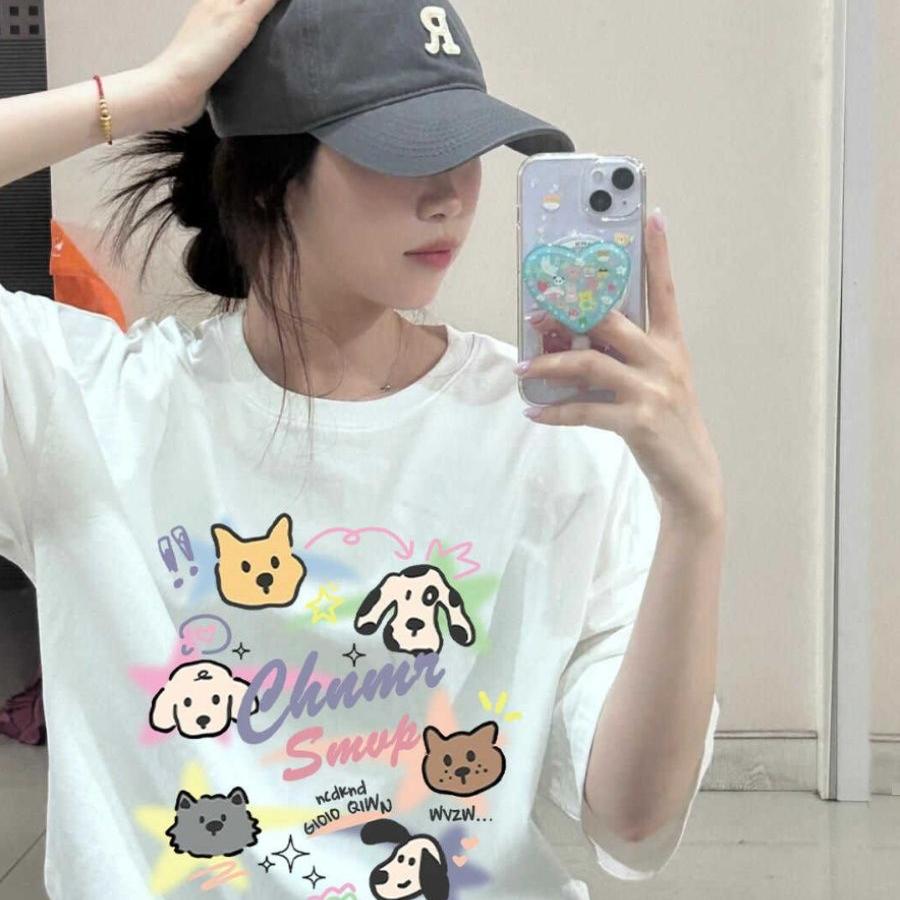 卡通彩色线条狗狗纯棉短袖t恤女新款夏季潮牌印花宽松情侣上衣服