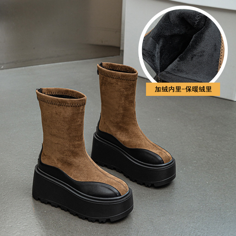小个子超高跟女靴8cm坡跟拼接松糕厚底内增高短靴弹力靴马丁靴潮