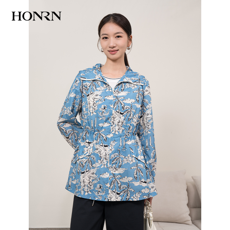 HONRN/红人休闲印花连帽抽绳收腰显瘦风衣外套女春秋款HI11OF857
