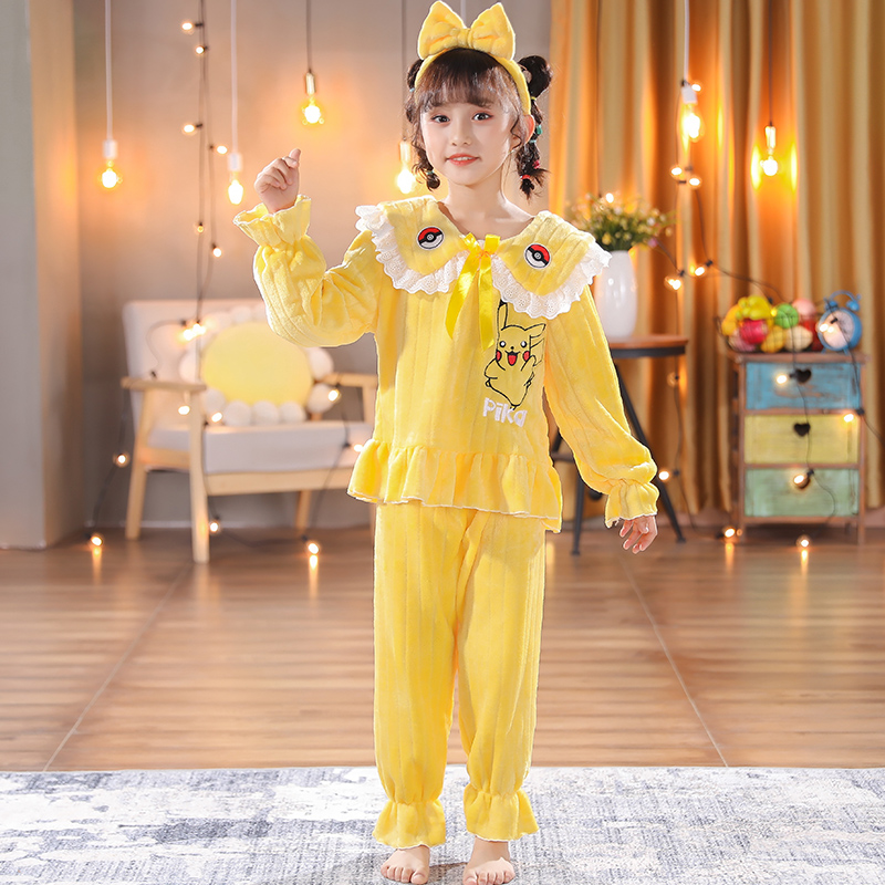 儿童睡衣法兰绒秋冬季公主花边卡通KT猫小女孩珊瑚绒保暖家居套装