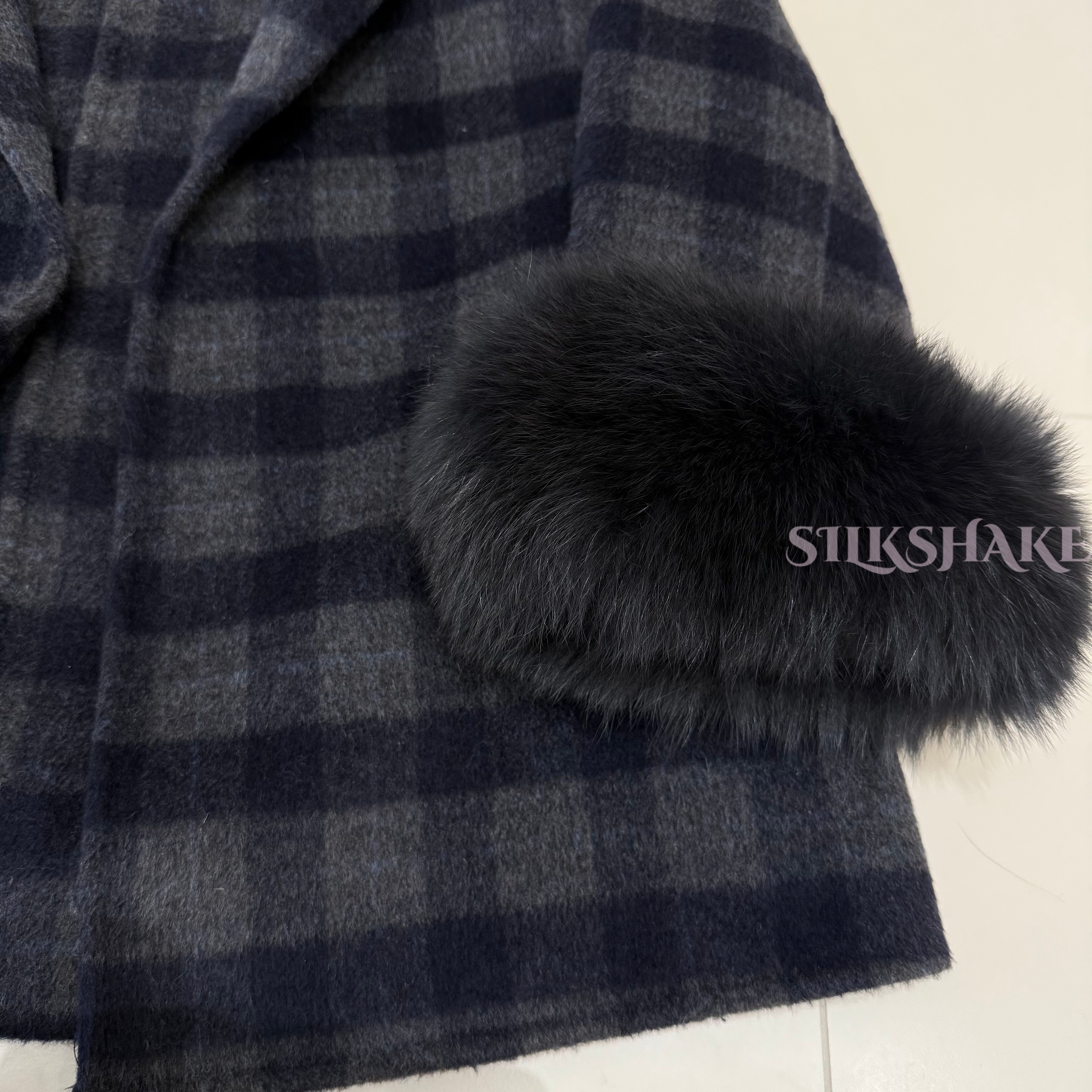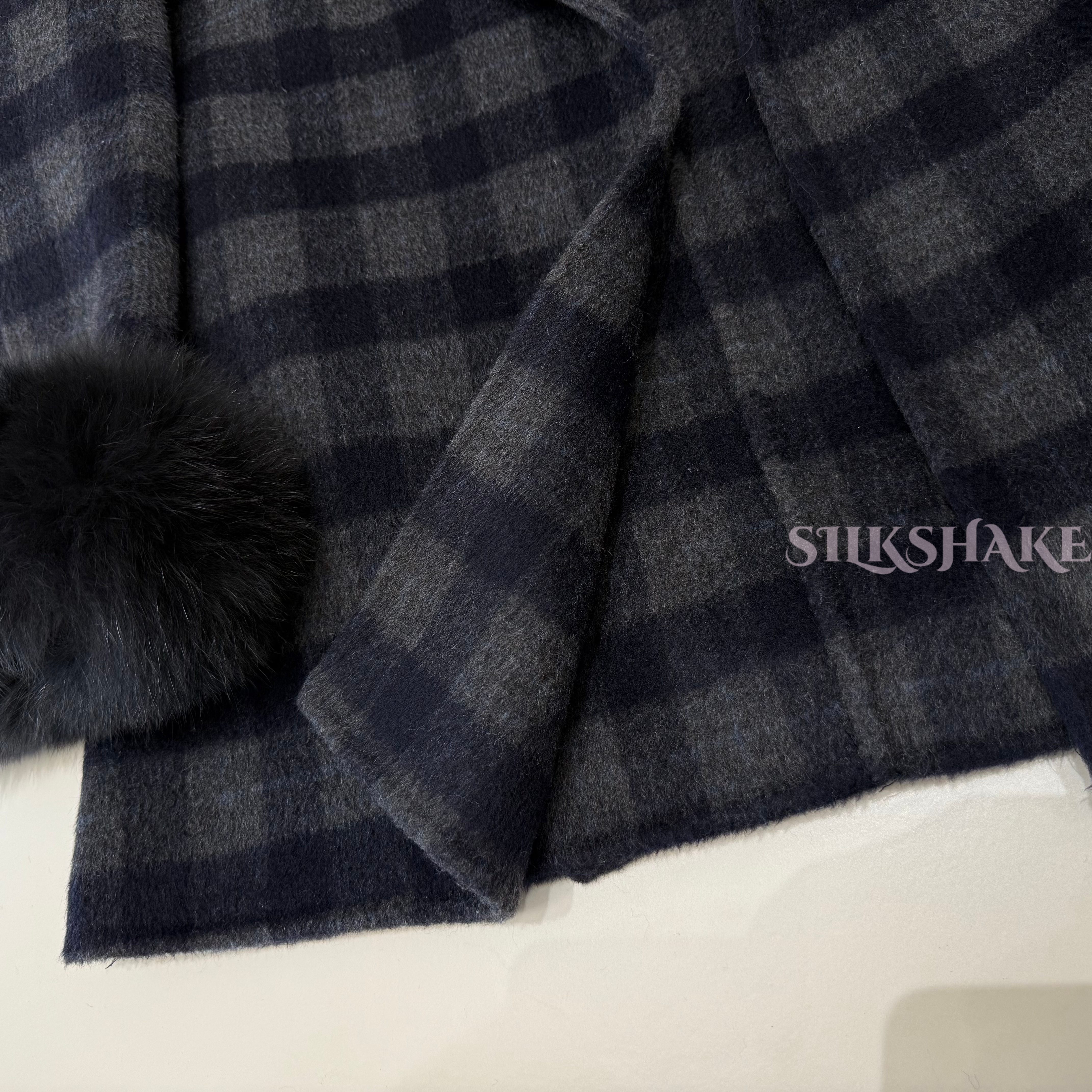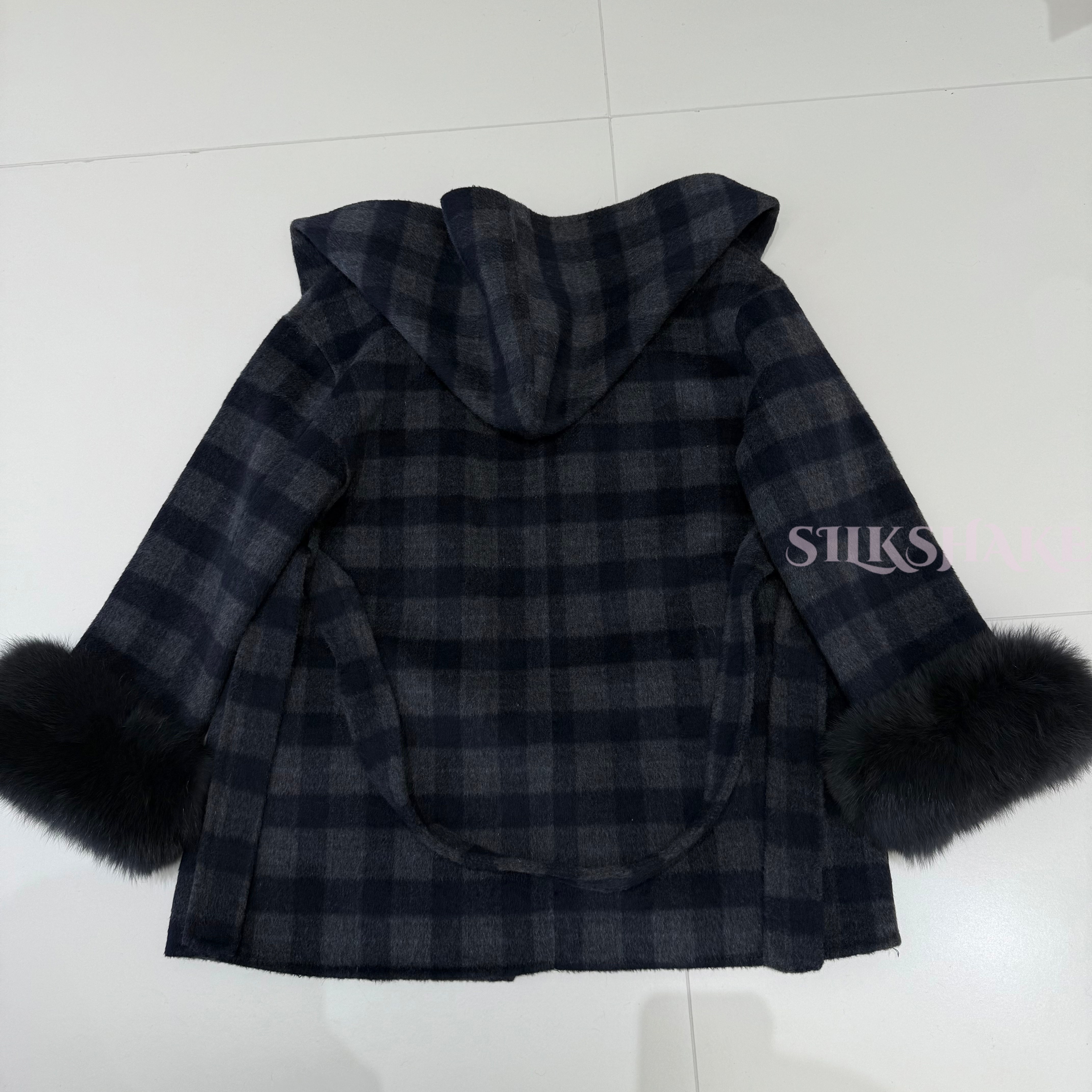 英伦风双面羊绒大衣女25秋冬新灰蓝格连帽毛袖口宽松休闲毛呢外套