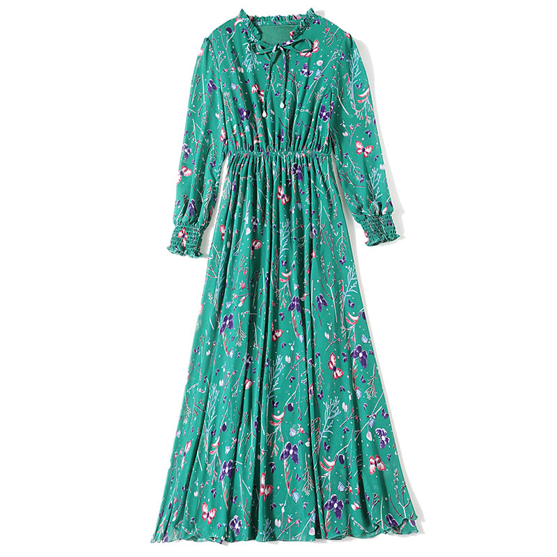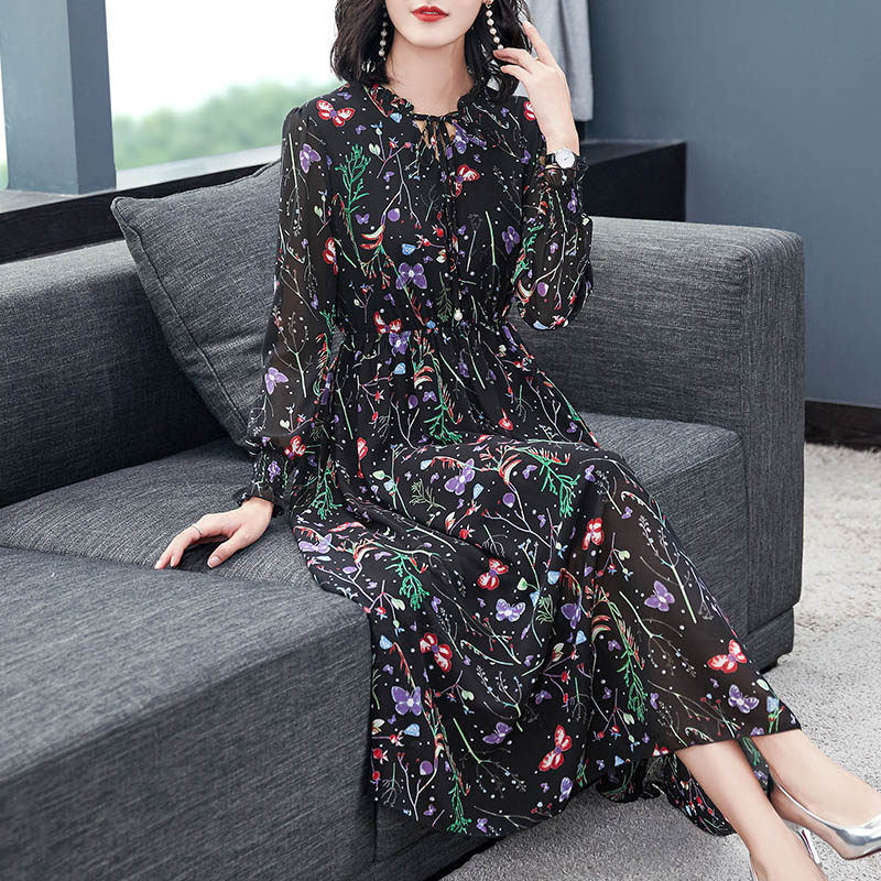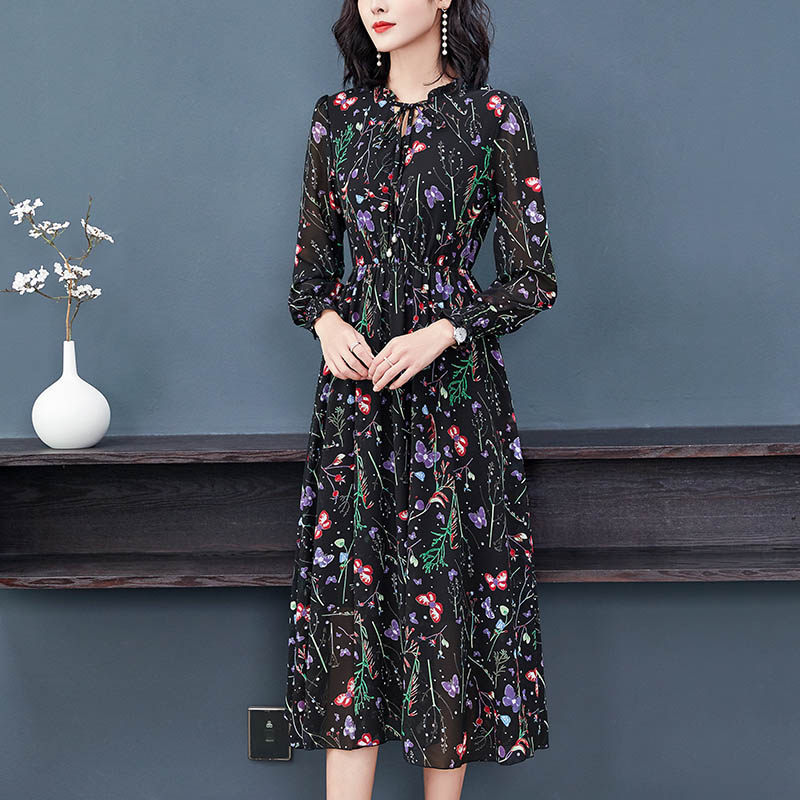 春秋雪纺连衣裙女长袖2025新款打底收腰显瘦长款气质大码碎花裙女