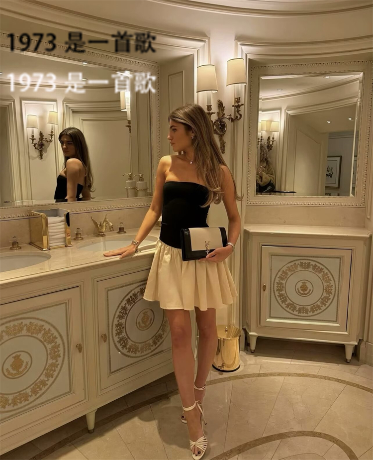 博主同款小众设计师款芭蕾风撞色小众抹胸裙拼接连衣裙高腰短裙夏