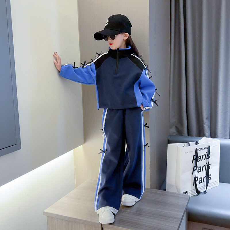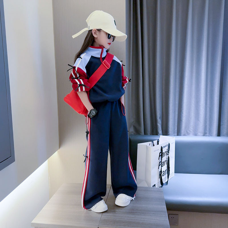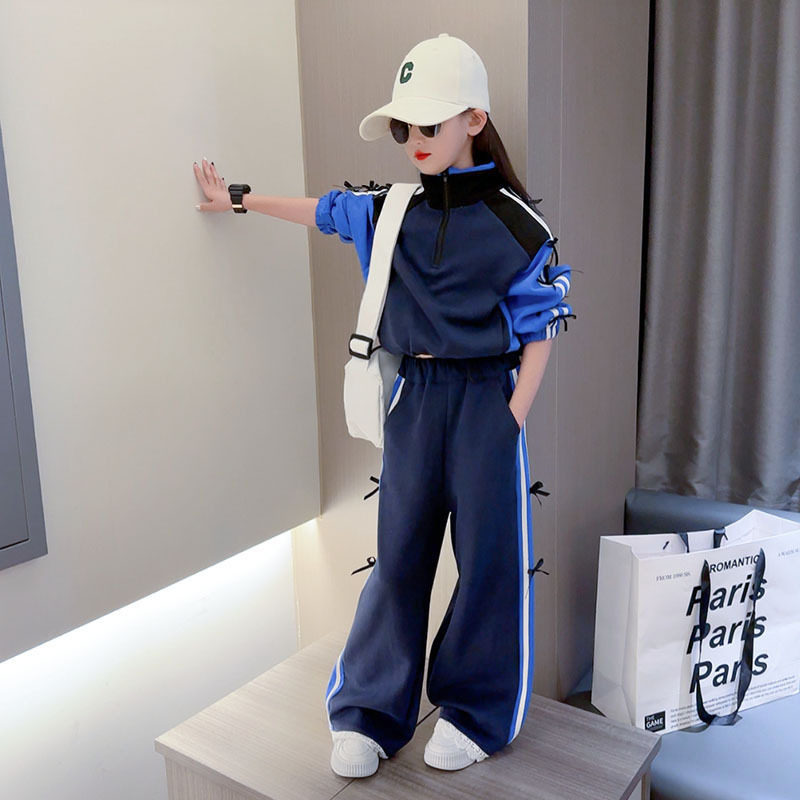 潮新款款宽松阔腿裤套装春秋时髦女童中大童2025外套连帽条纹