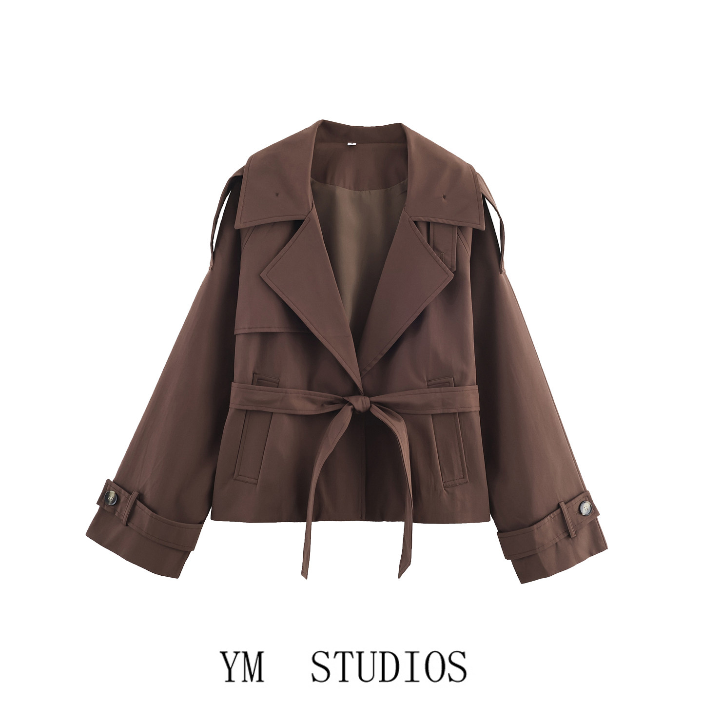 欧美女装 美拉德风翻领系带收腰短款风衣女棕褐色气质休闲外套