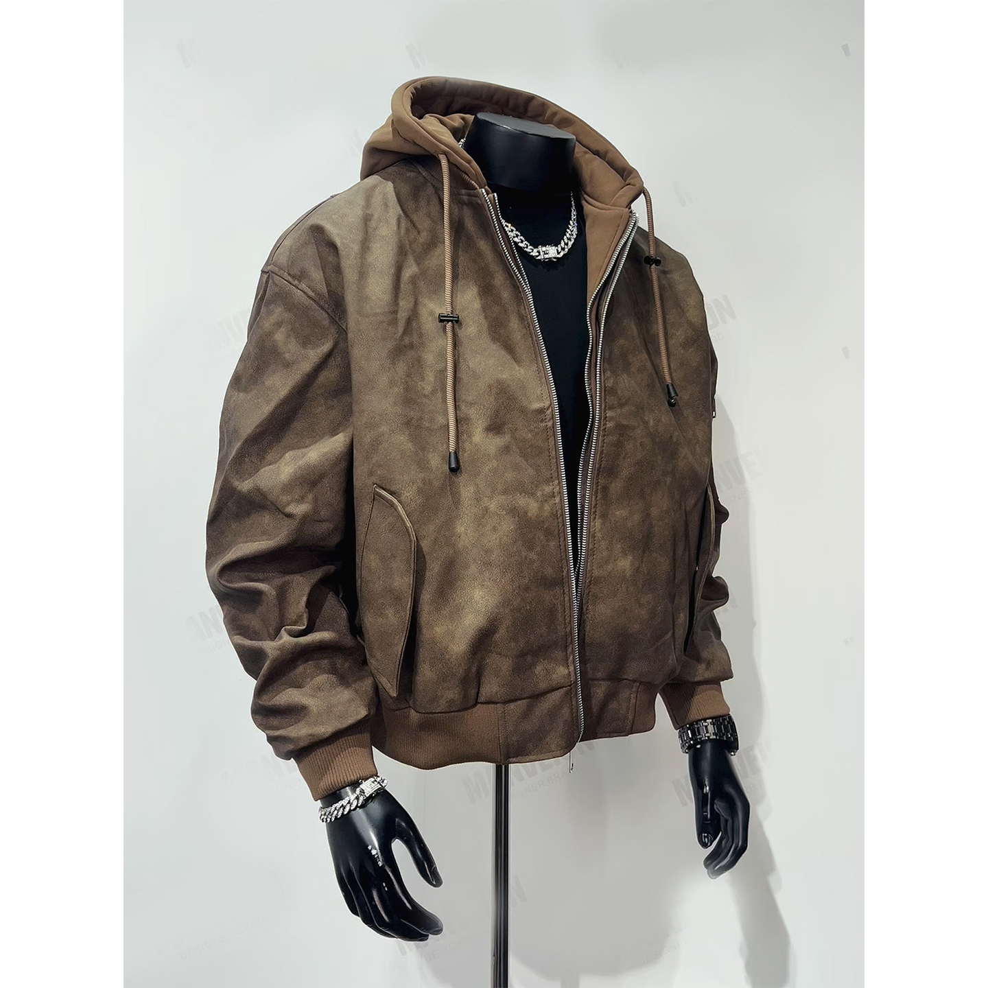 假两件夹棉飞行夹克棉服男款冬季加厚保暖pu皮衣外套短款连帽棉衣