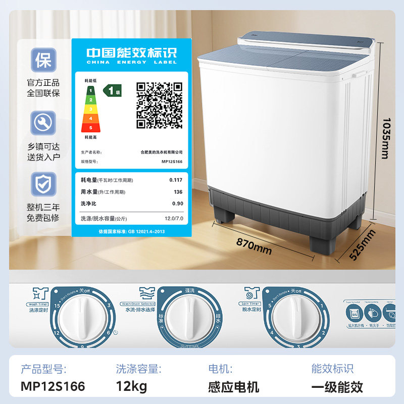 美的12kg大容量半自动双桶波轮