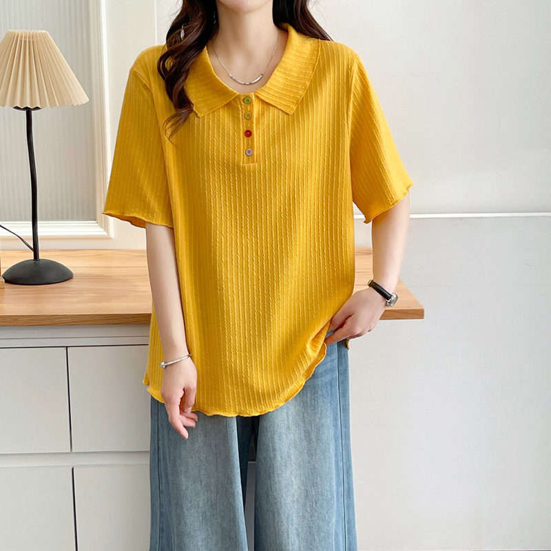 翻领短袖t恤女大码2025夏季新款胖mm200斤彩色纽扣肌理感半袖上衣