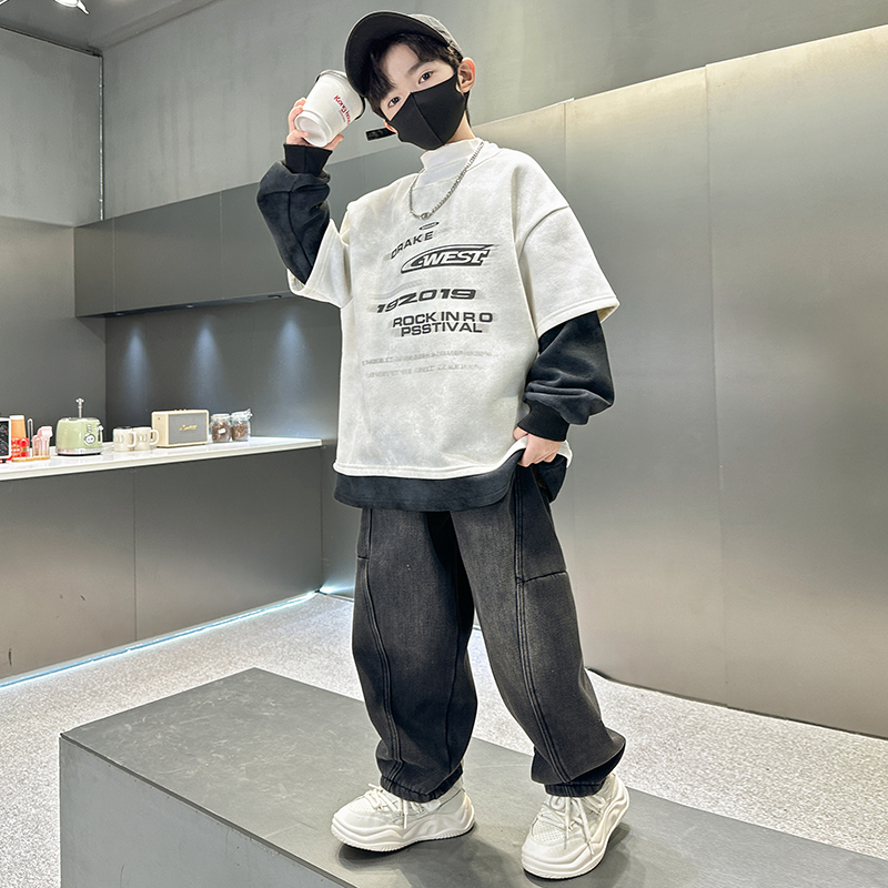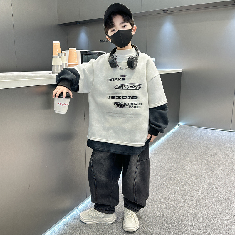 男童加绒卫衣秋冬款2025新款儿童装冬装加厚假两件打底衫上衣冬季