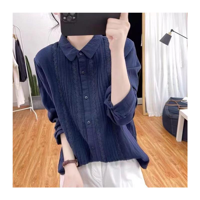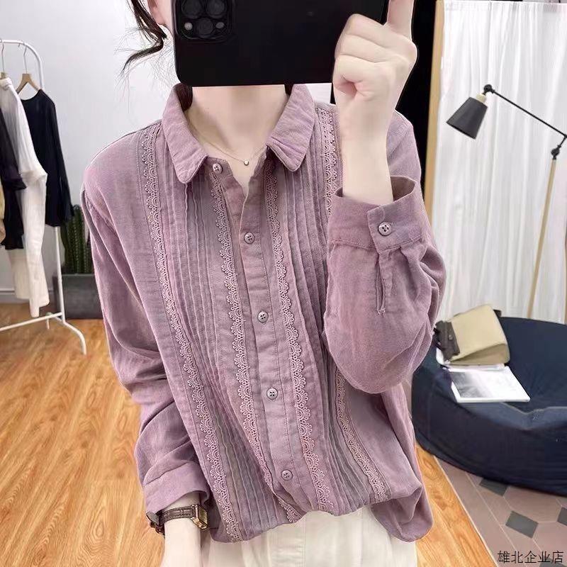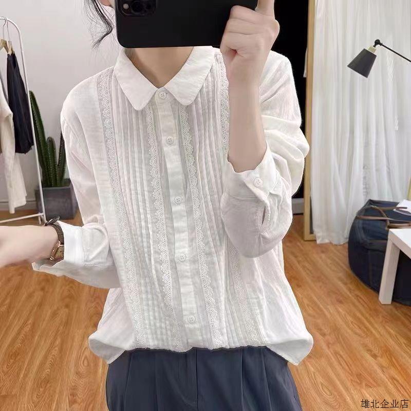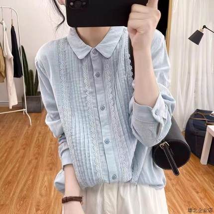 设计感小众蕾丝拼接棉麻衬衫上衣女春秋复古宽松休闲褶皱打底衬衣