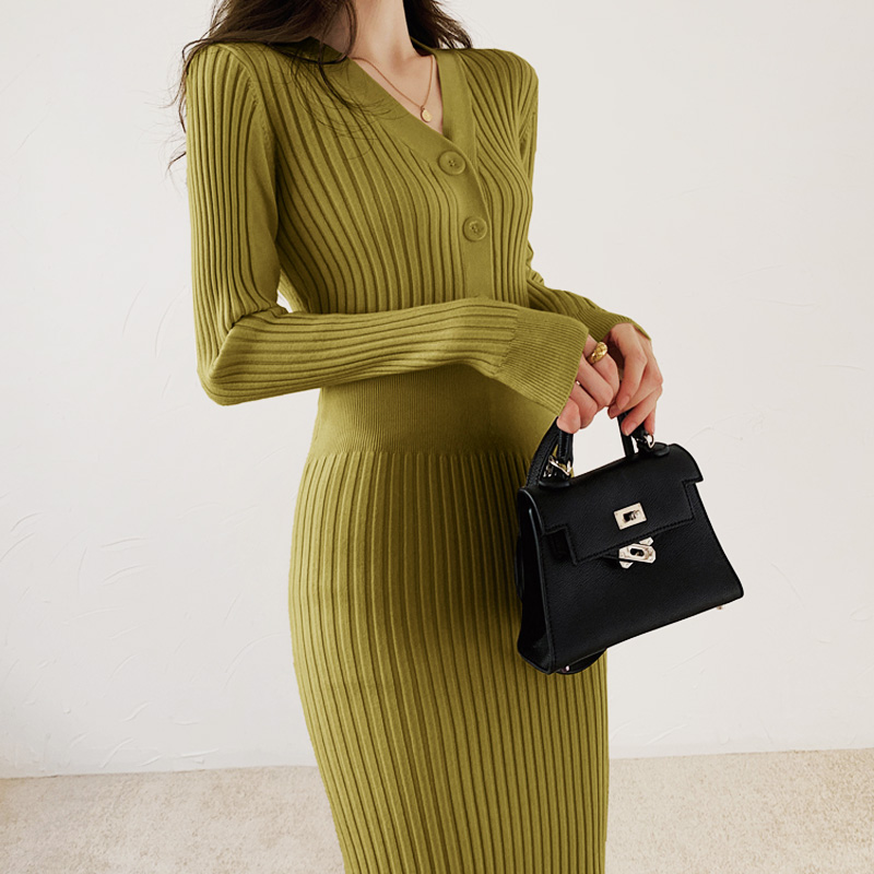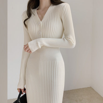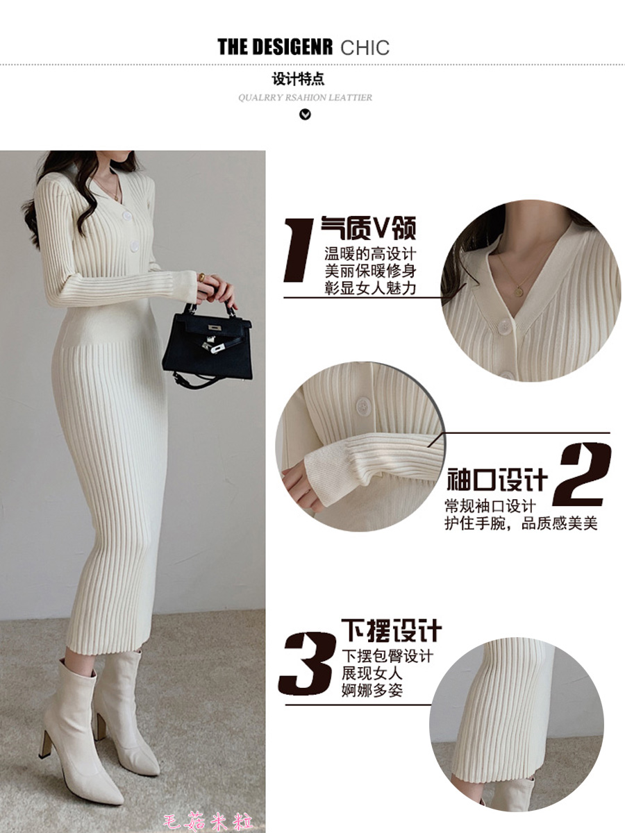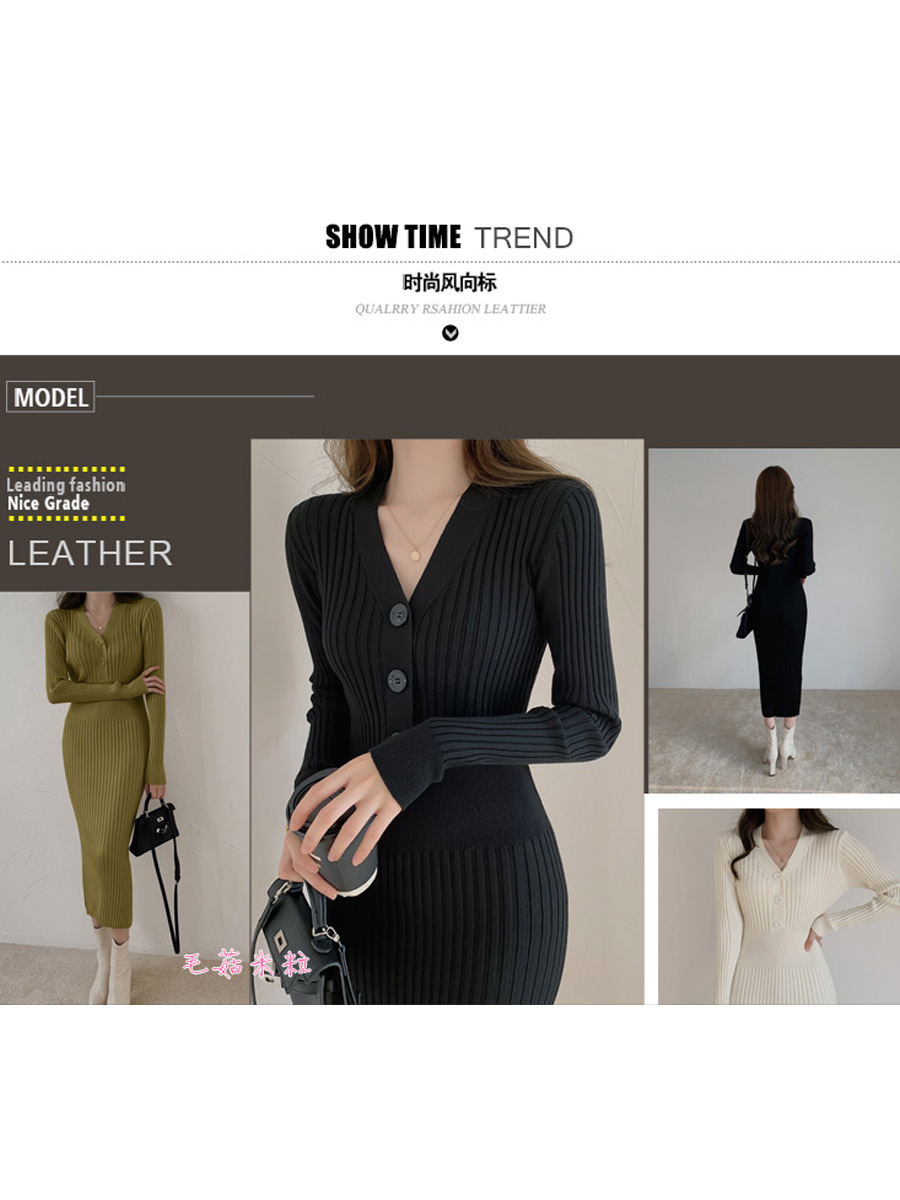 针织连衣裙女秋冬v领名媛气质高级感修身性感配大衣打底毛衣裙子
