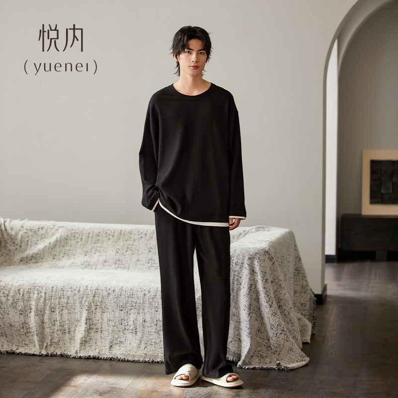 悦内睡衣男士春秋款纯棉长袖家居服四季通用黑色高级感大码可外穿