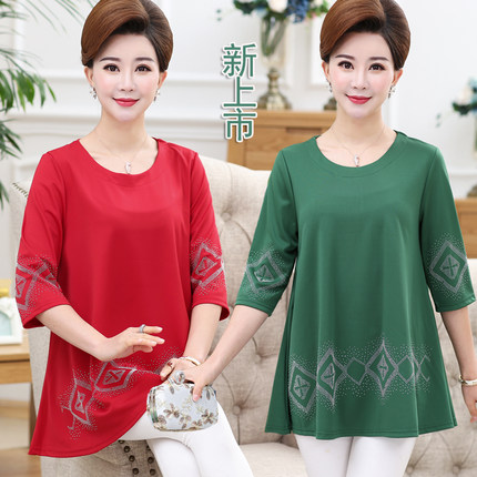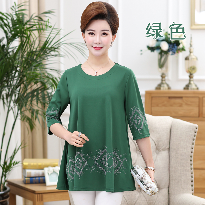 气质胖MM妈妈装春夏新款圆领大板T恤中老年女装大码镶钻中袖上衣