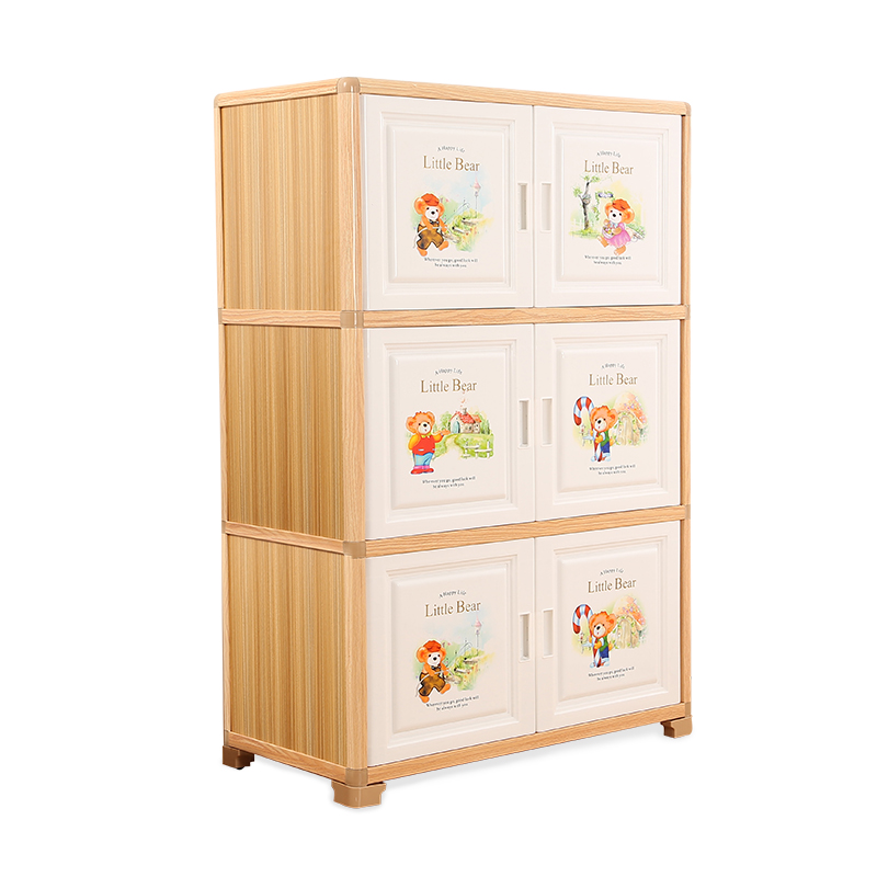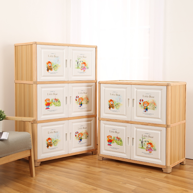 儿童衣柜收纳柜卡通经济型铝合金浅木纹塑料双开门宝宝储物柜组合
