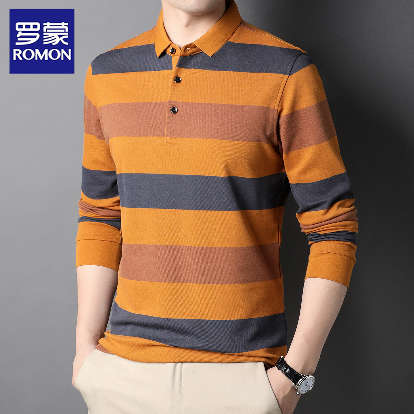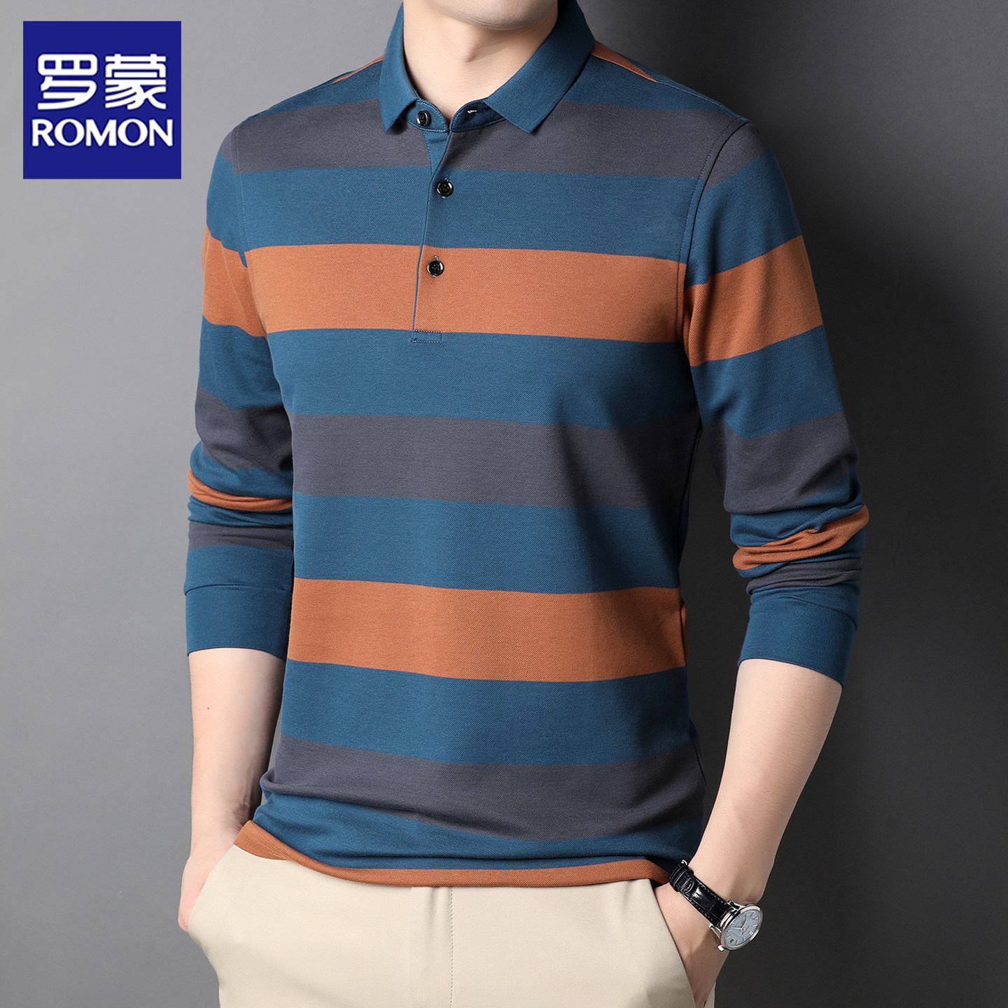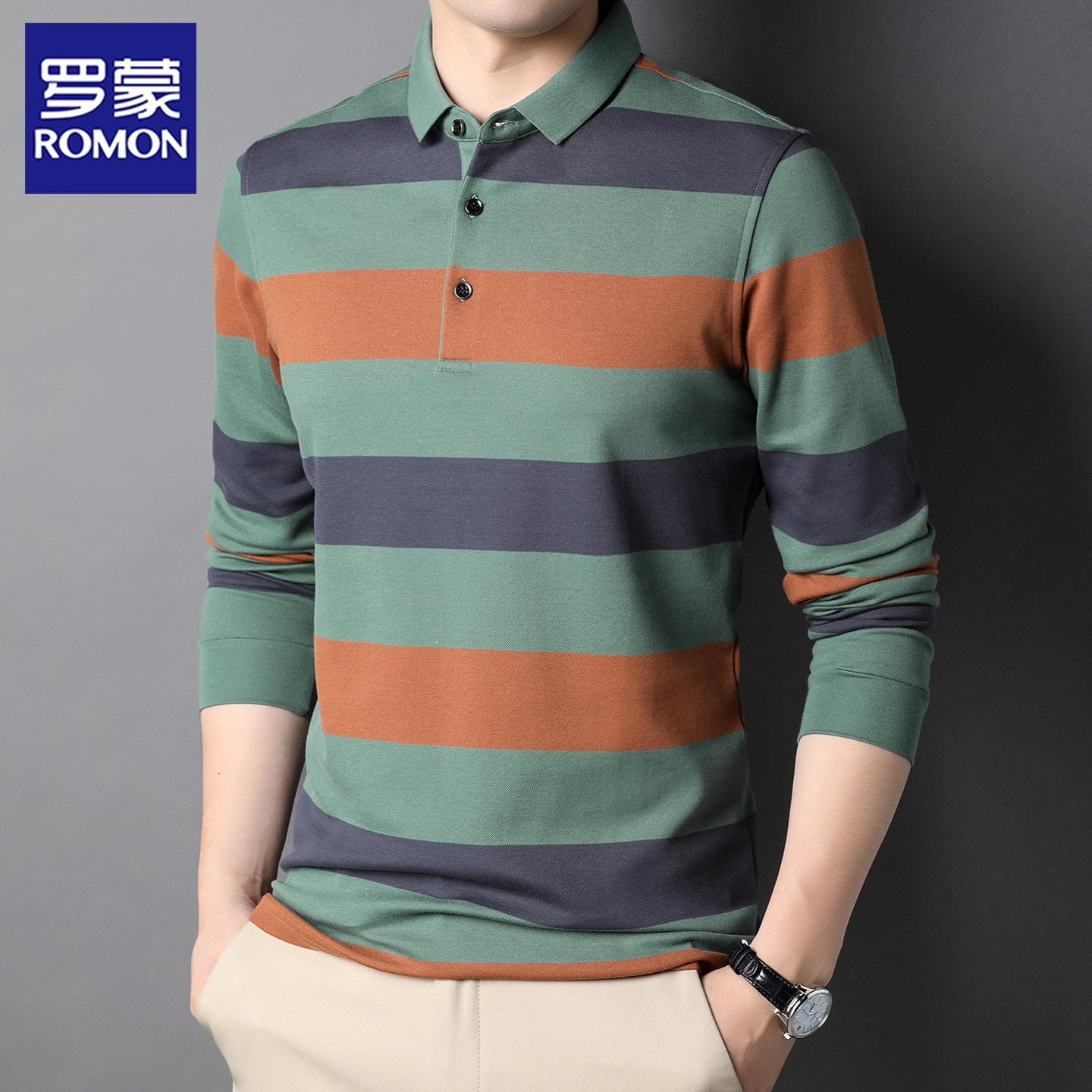 罗蒙100%纯棉条纹polo衫男长袖