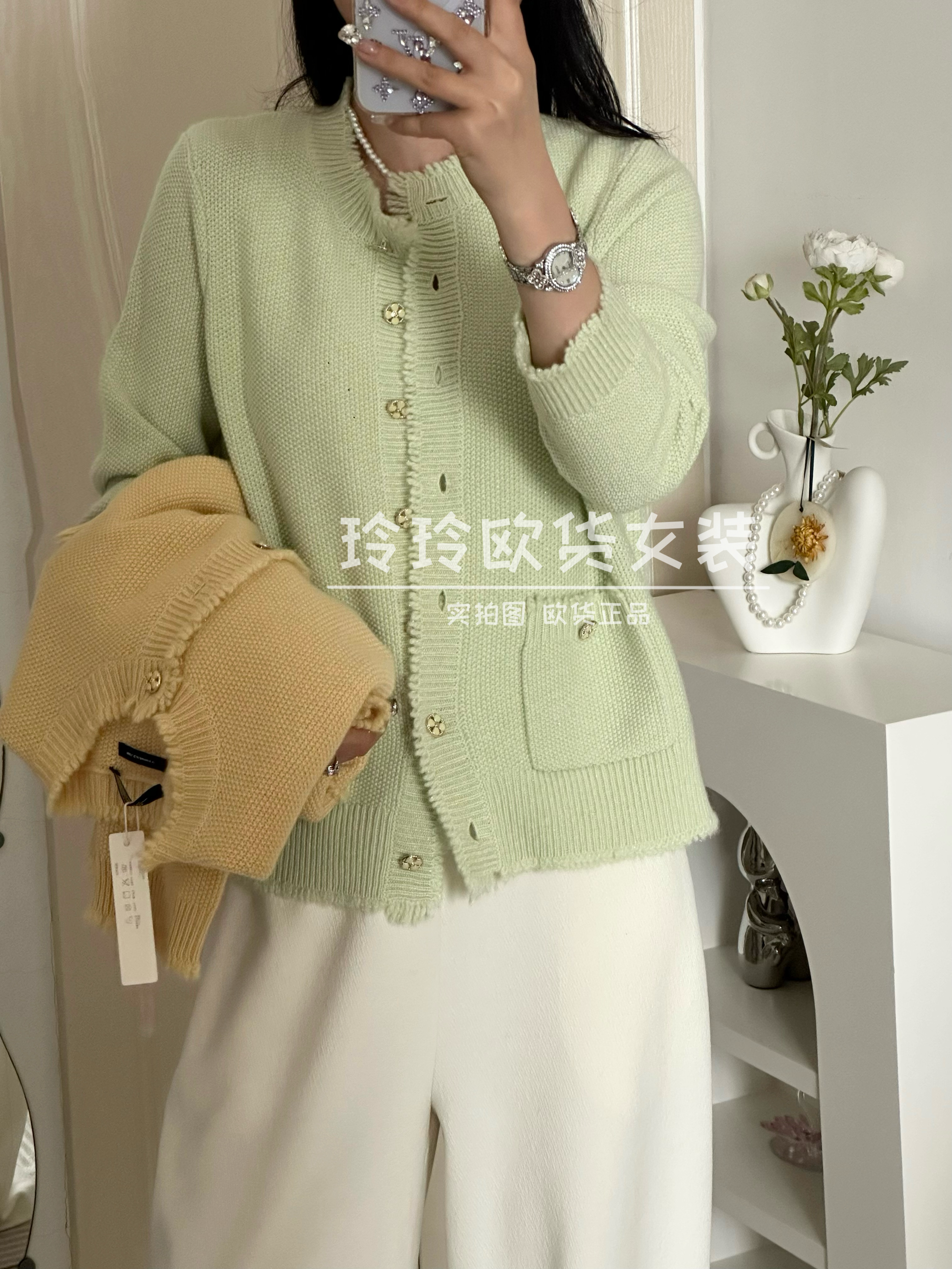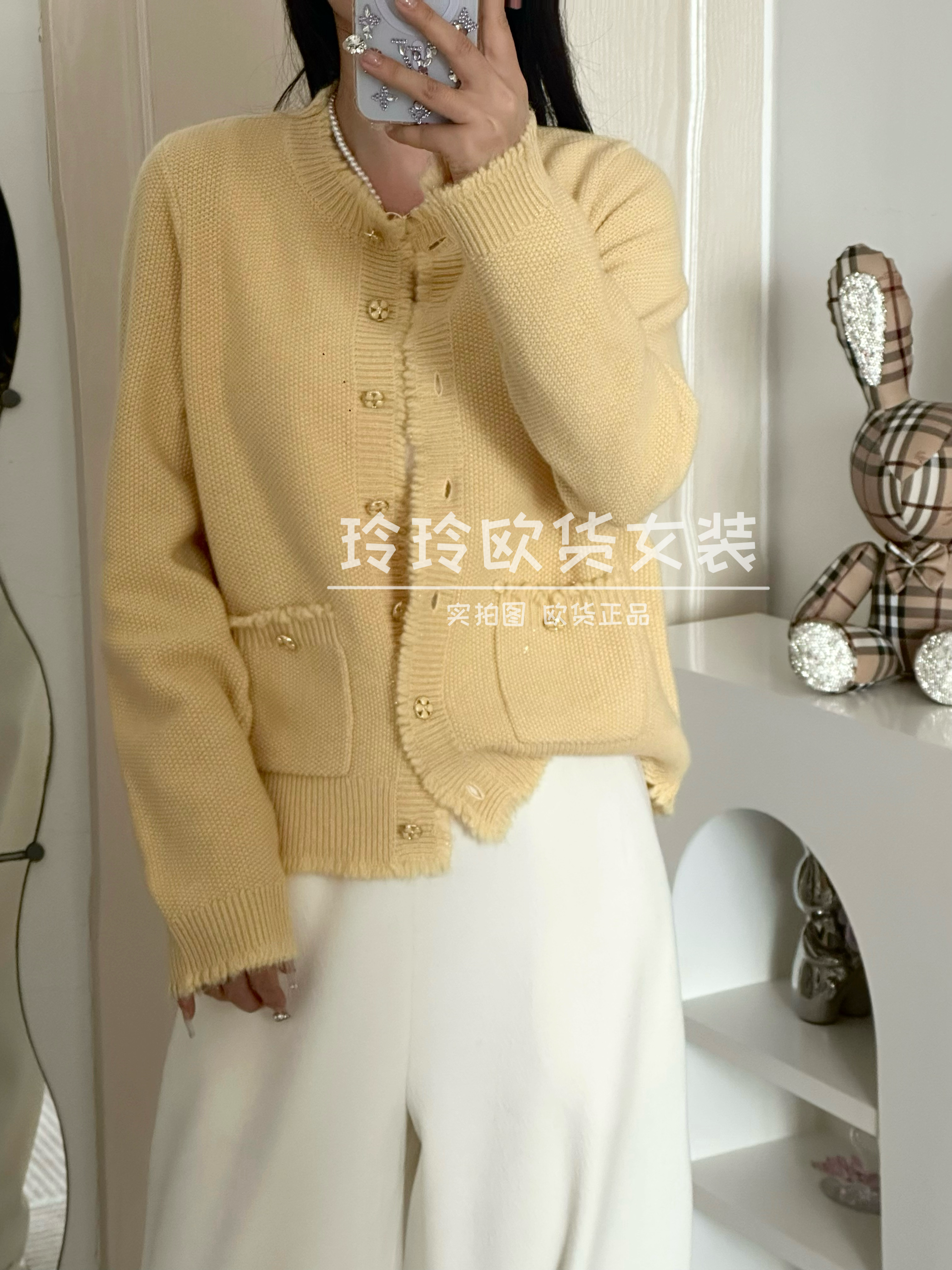 2025欧货新款高品质圆领小香风JCLB纯色单排扣毛边山羊绒针织开衫