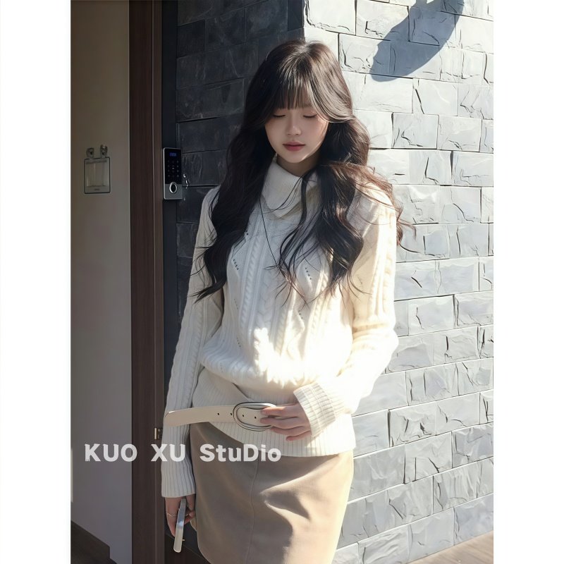 秋冬穿搭韩系慵懒感翻领针织衫套头毛衣高腰包臀短裙半身裙套装女