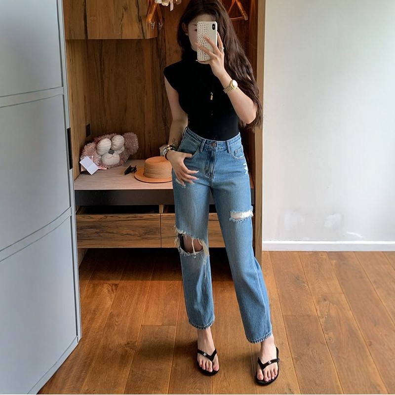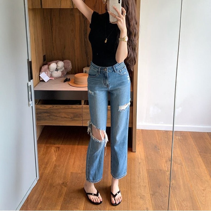 李李服饰窄版破洞直筒牛仔裤女25冬季新款高腰修身显瘦直筒九分裤