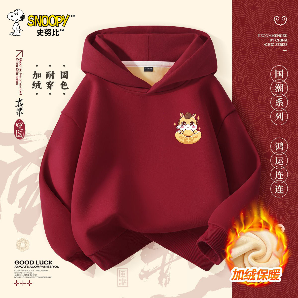 史努比喜庆红色连帽卫衣加绒上衣