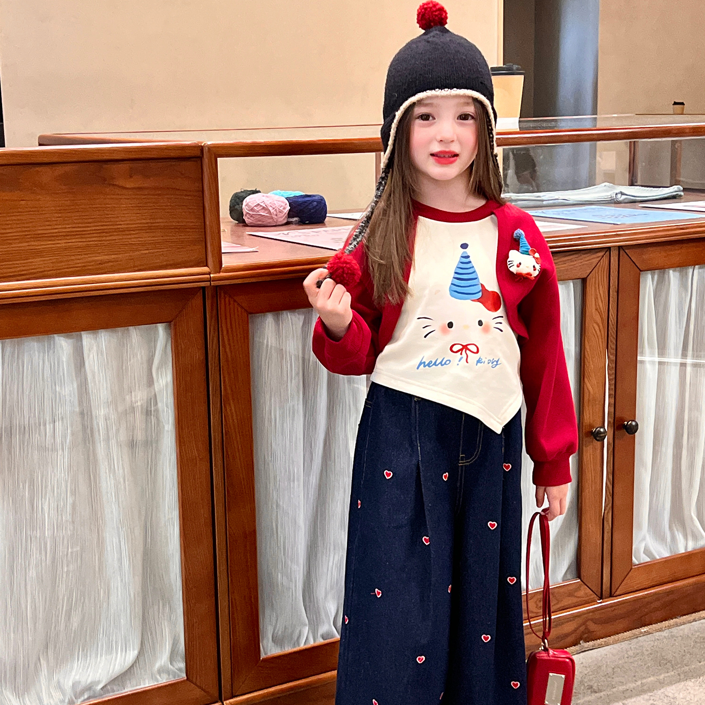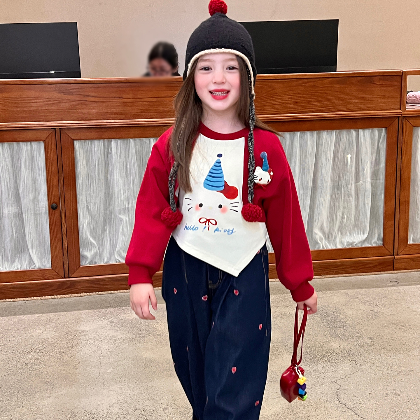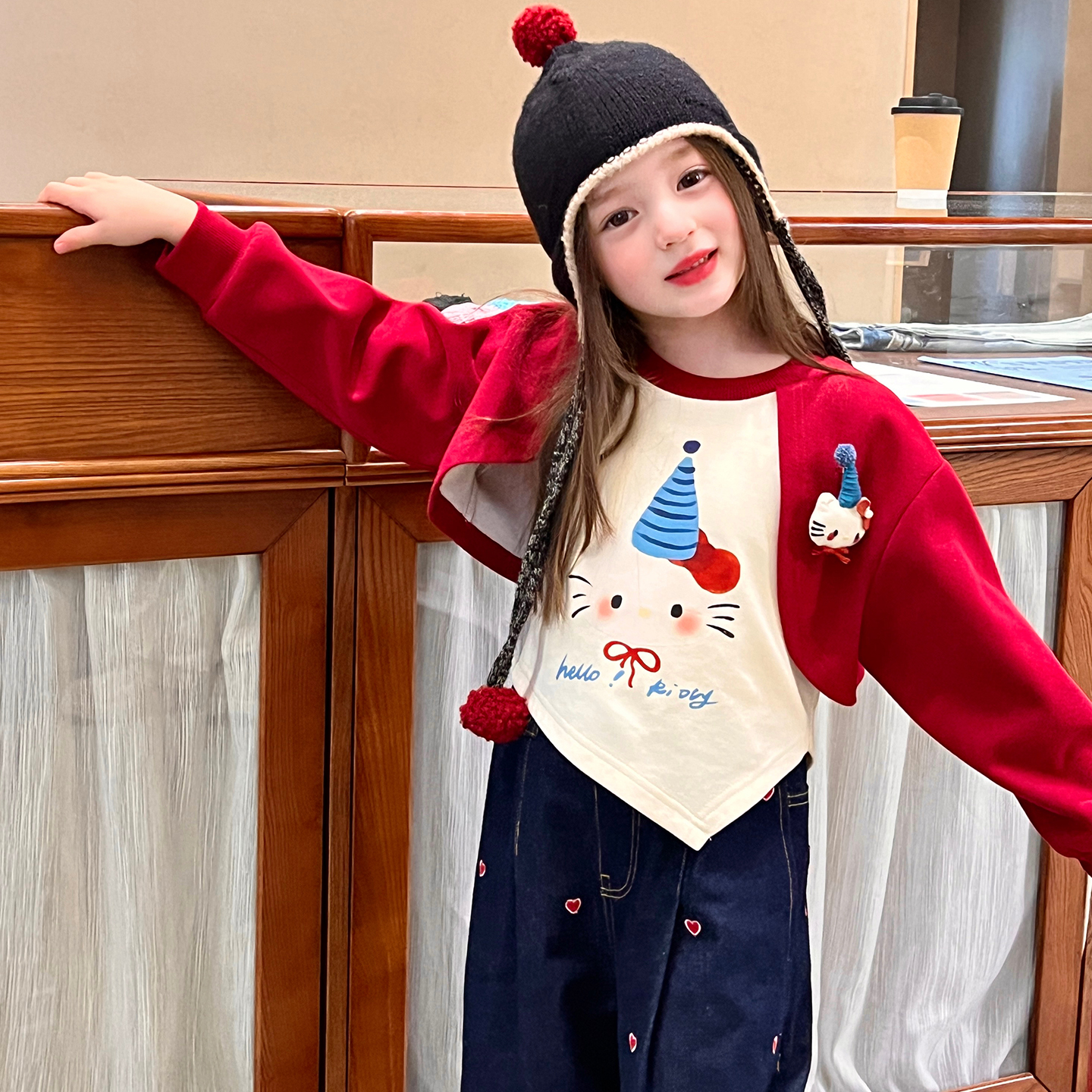 栀了成长记童装女童假两件加绒卫衣秋季新款儿童宝宝百搭印花上衣