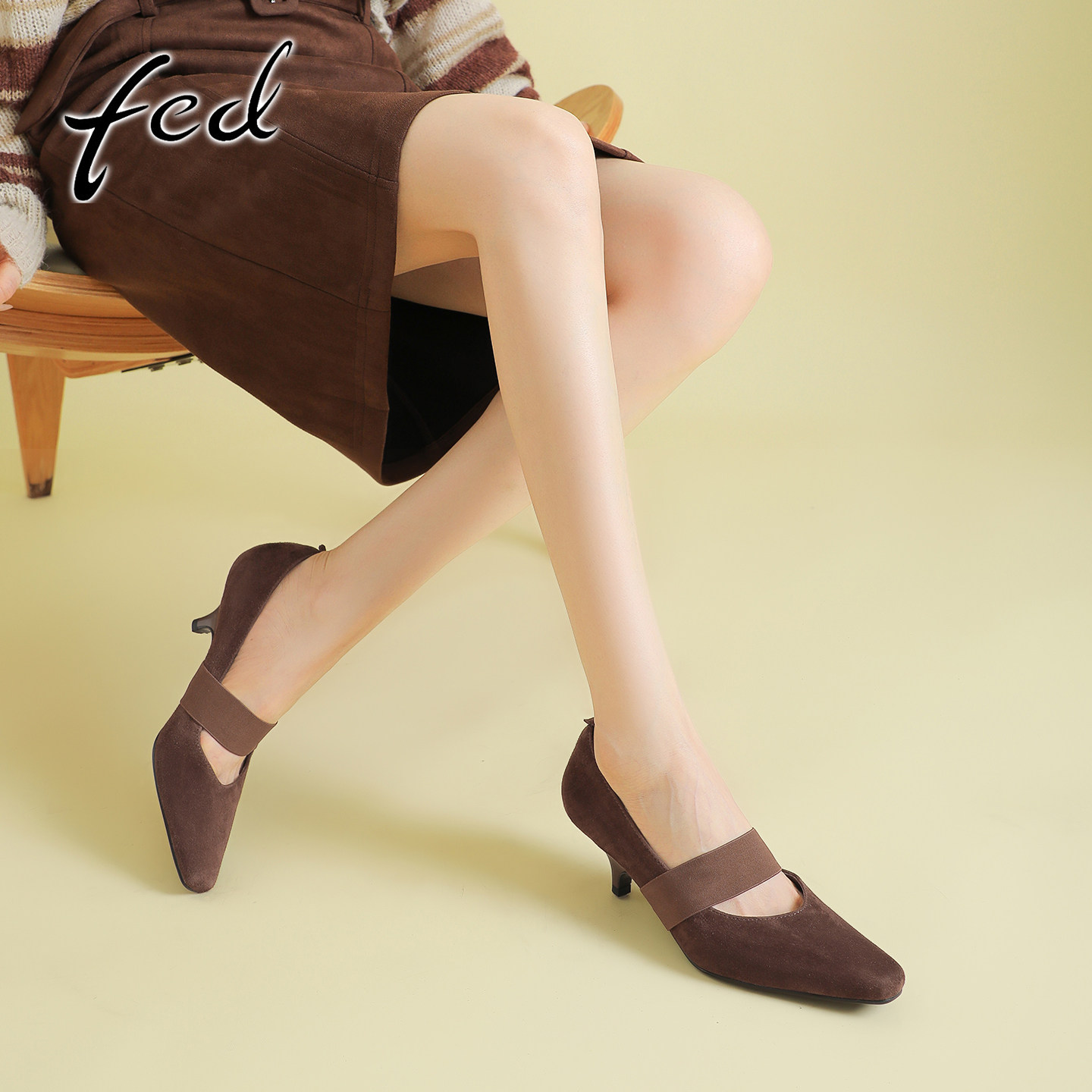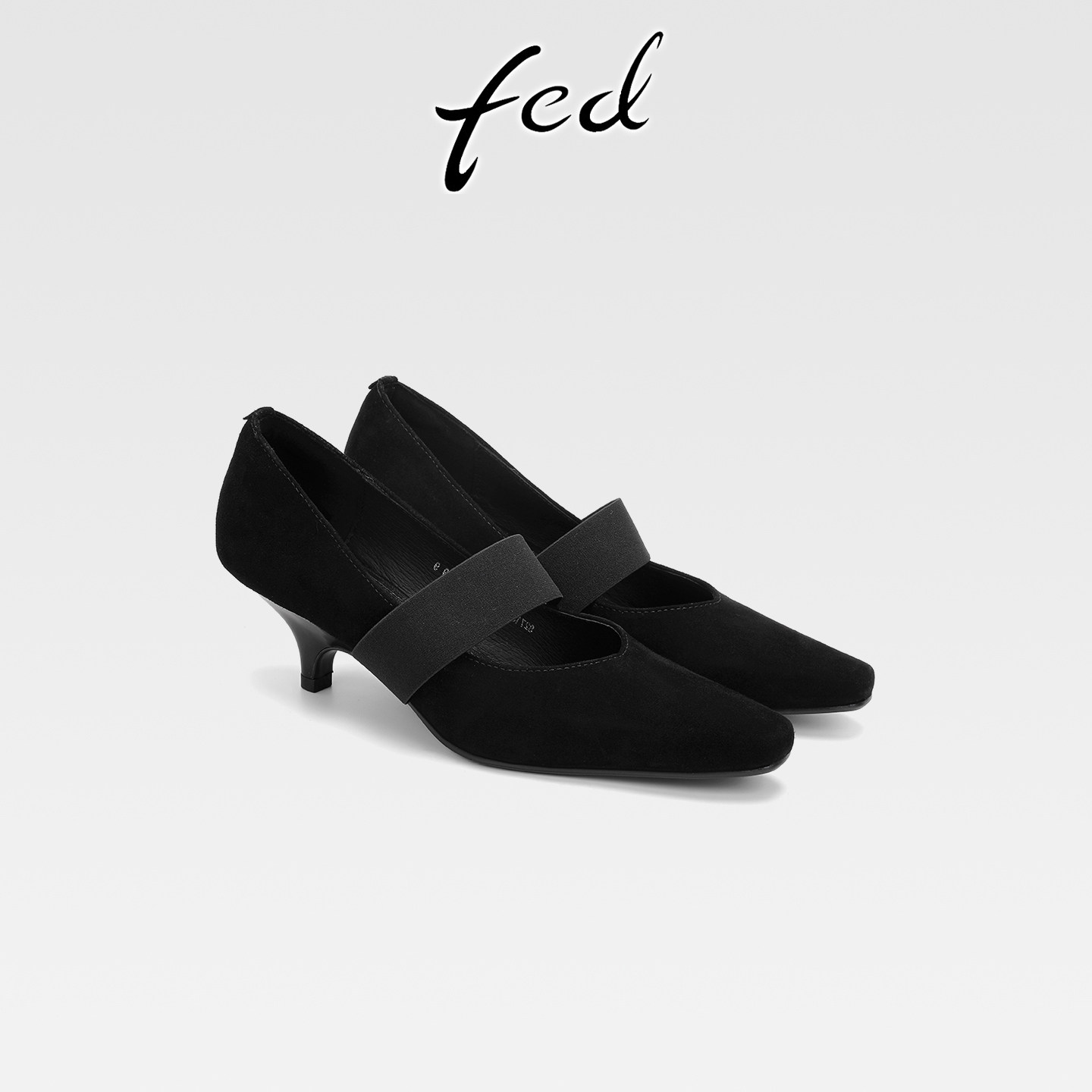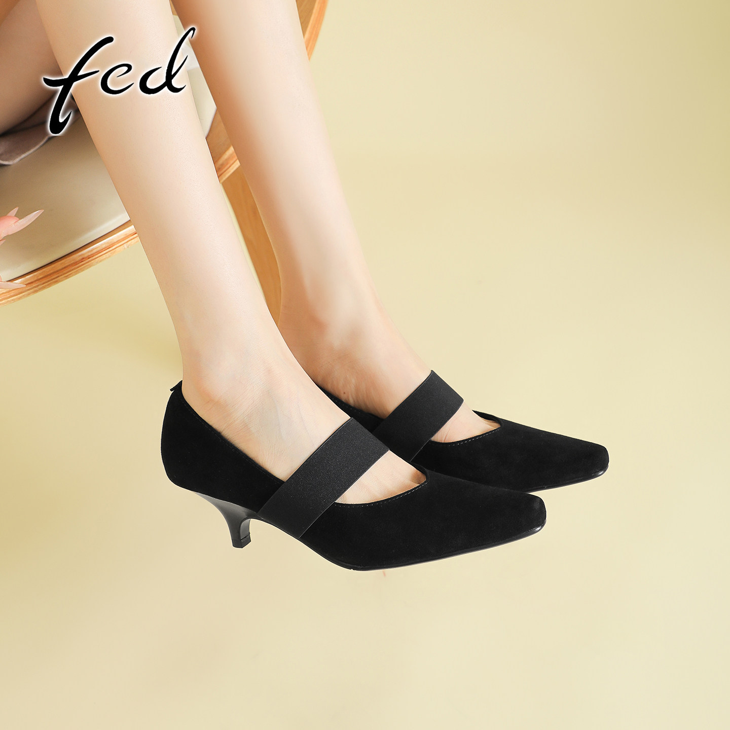 fed法式复古羊反绒细跟玛丽珍鞋女春秋款一字带中跟方头浅口单鞋