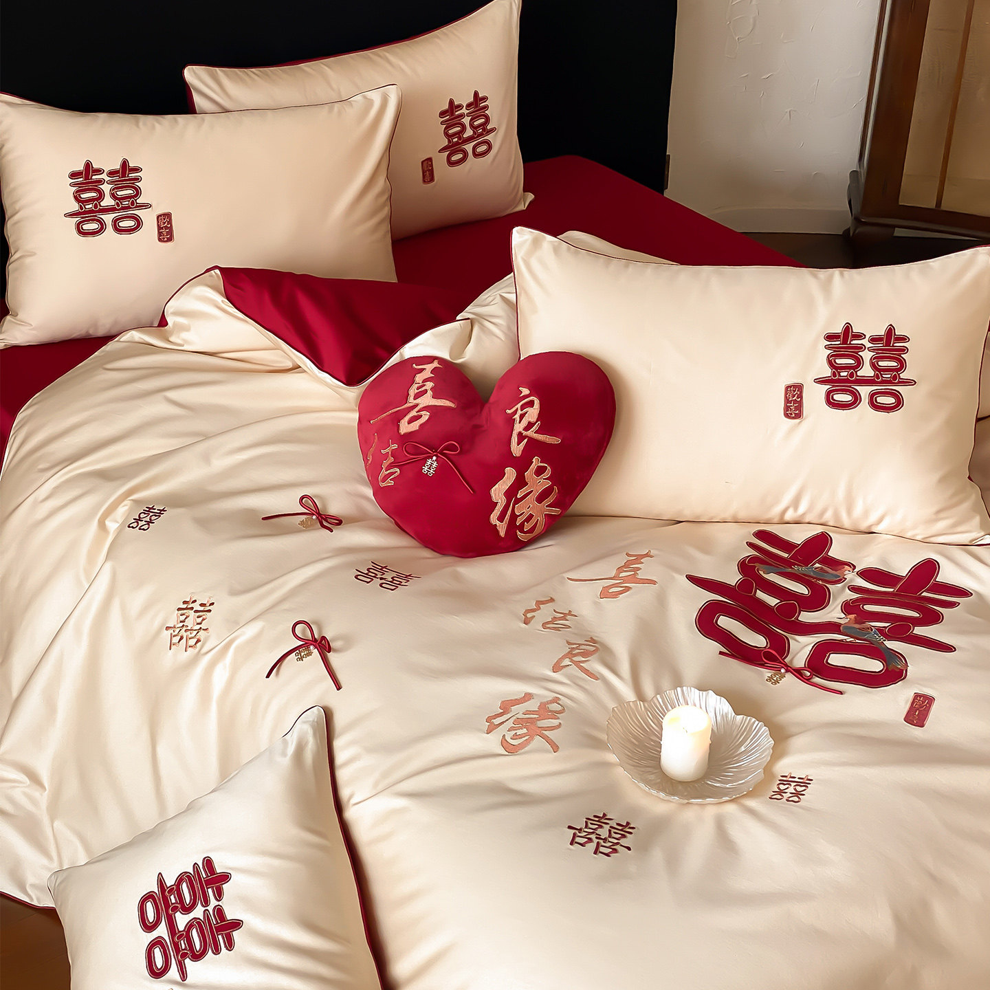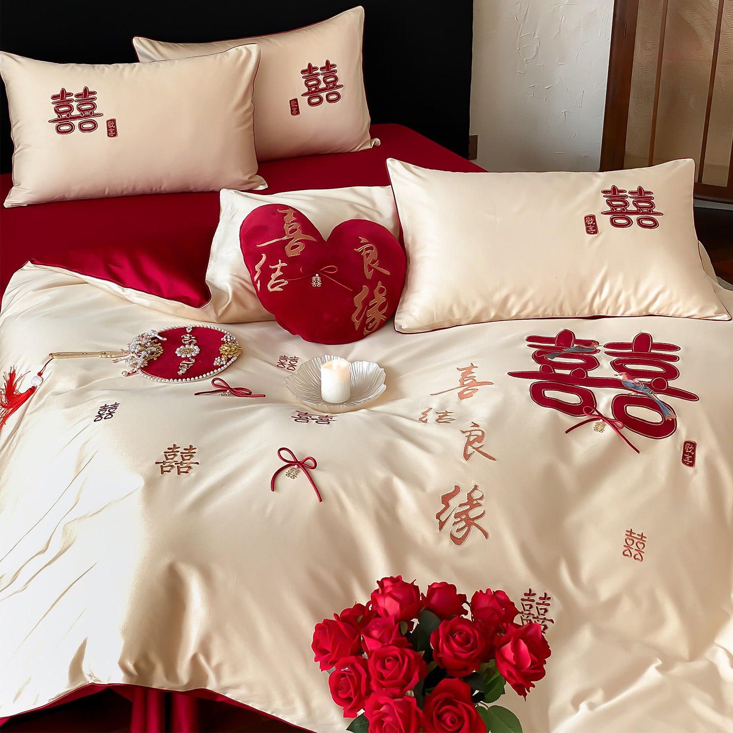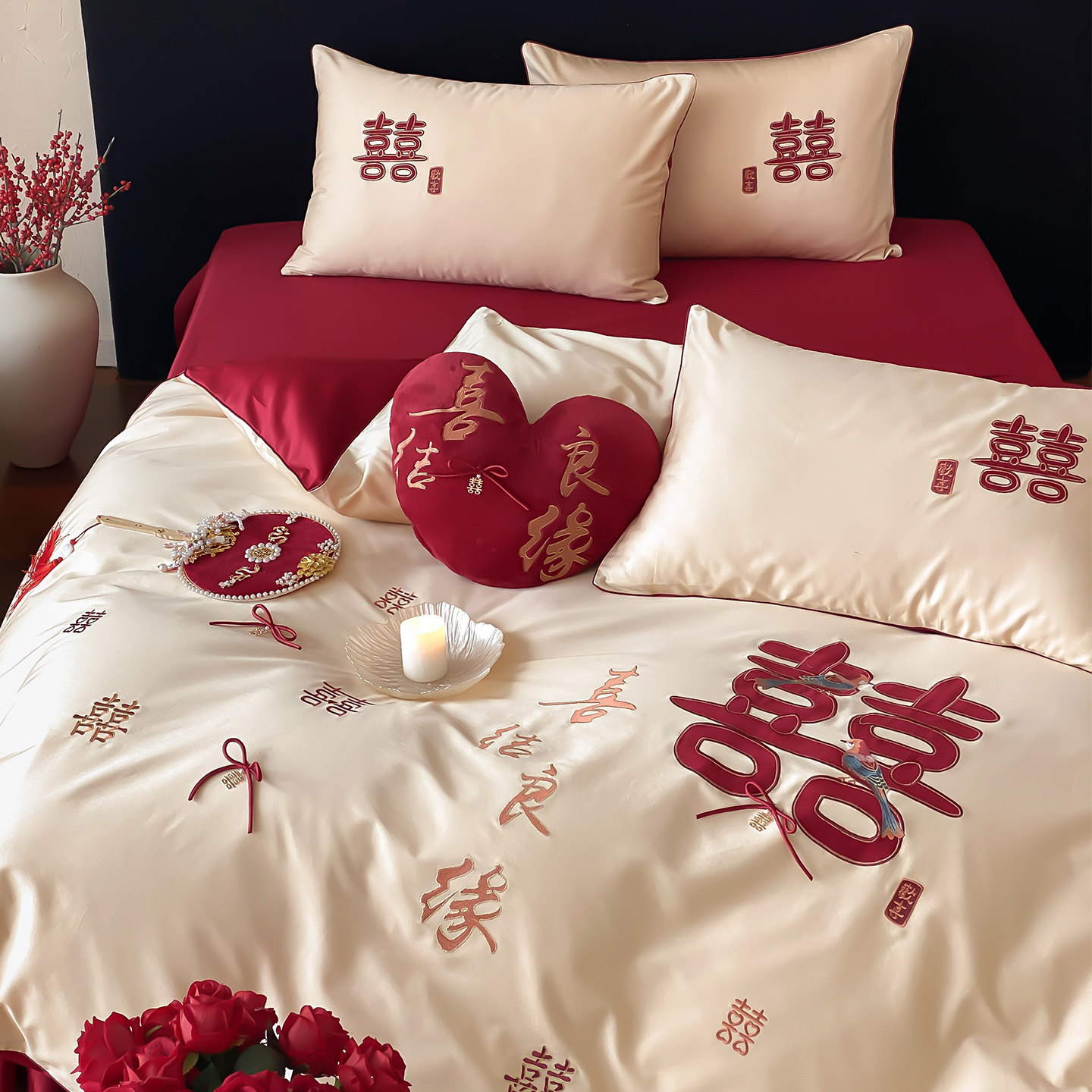 LANSWAY喜鹊双喜婚庆四件套全棉刺绣红色结婚被套纯棉床单1.8床笠
