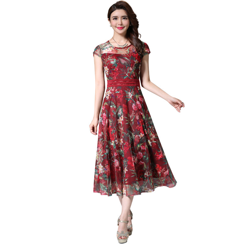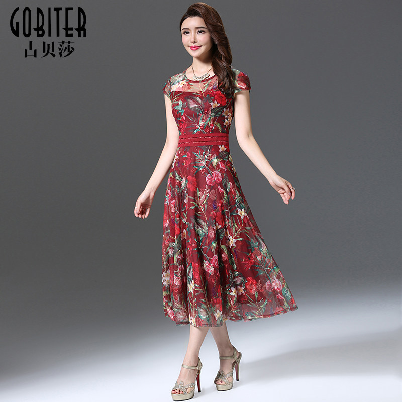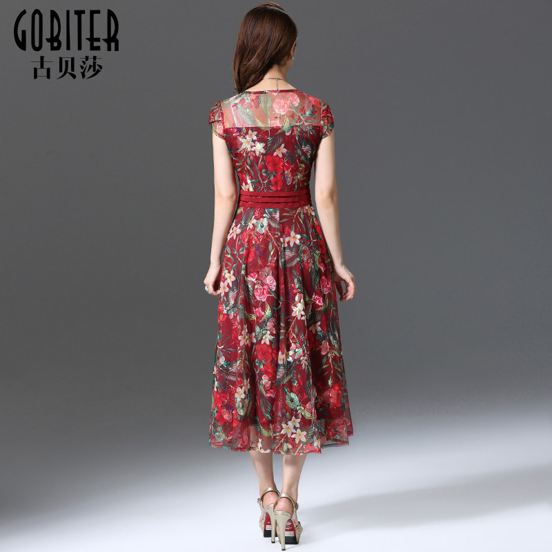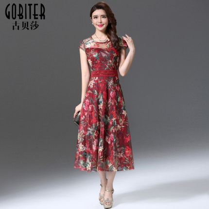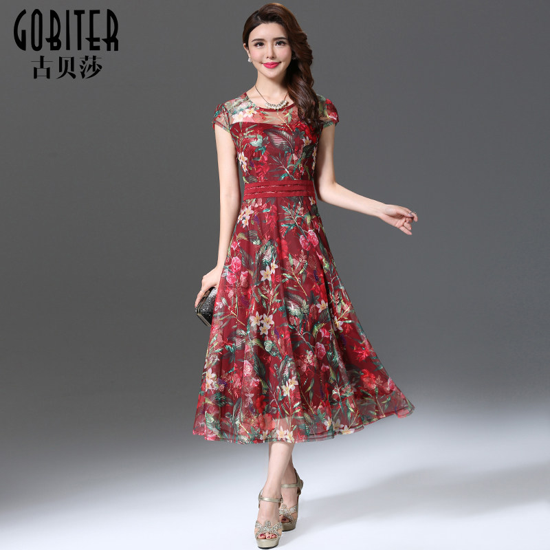 古贝莎女装夏季台湾品牌洋气高贵妈妈刺绣印花连衣裙中长裙子