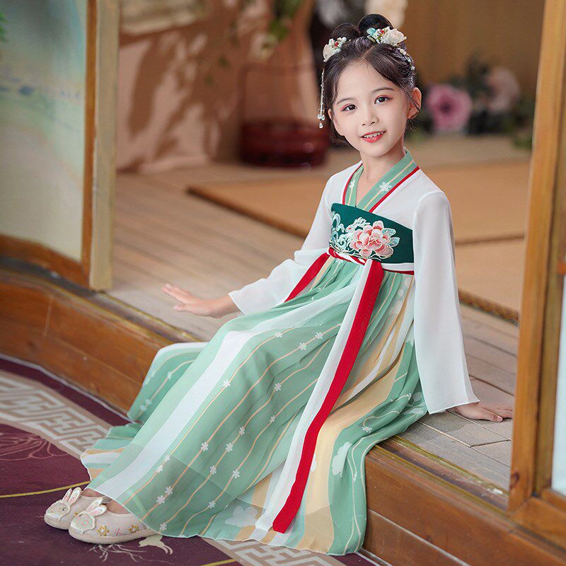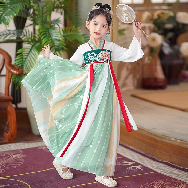 六一儿童汉服国风古典舞蹈服桃花笑上春山小城谣胭脂妆采莲演出服