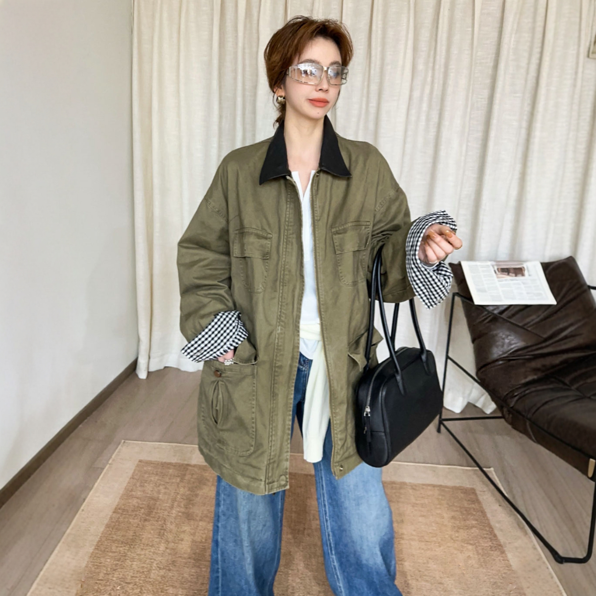 撞色翻领格子休闲风衣女欧洲站2025秋装新款欧货女装中长款外套潮