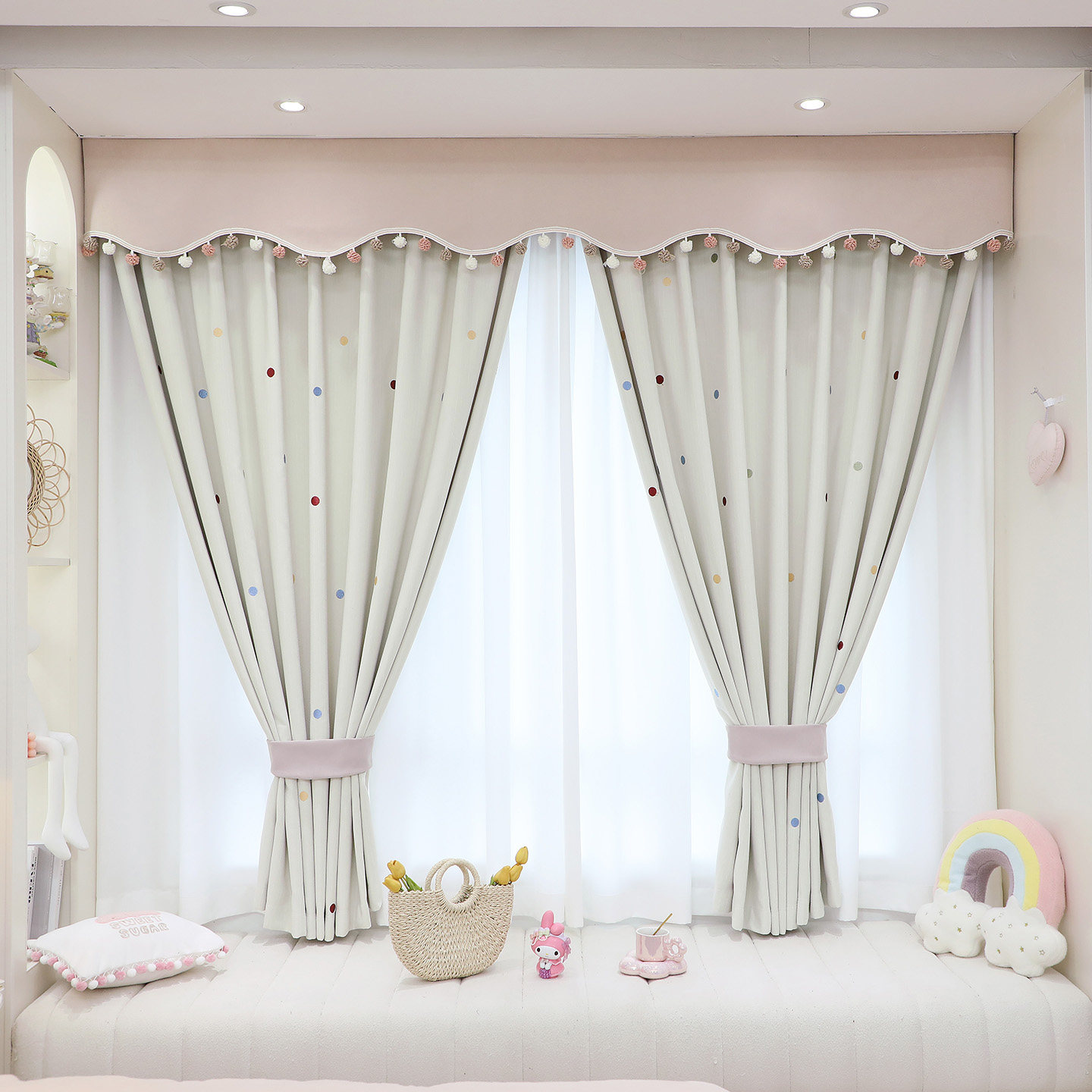 韩式儿童房卧室窗帘圆点刺绣遮光雪尼尔帘头魔术贴带毛球挡光帘幔