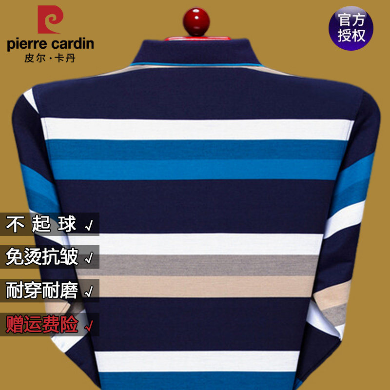 皮尔卡丹秋冬季男士翻领棉质长袖Polo衫中年休闲条纹真口袋打底衫