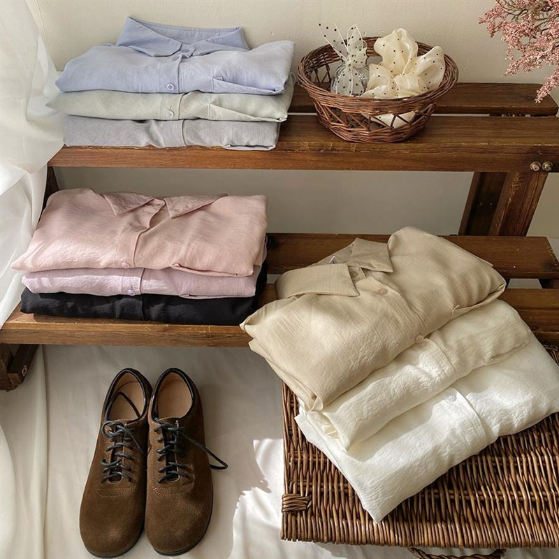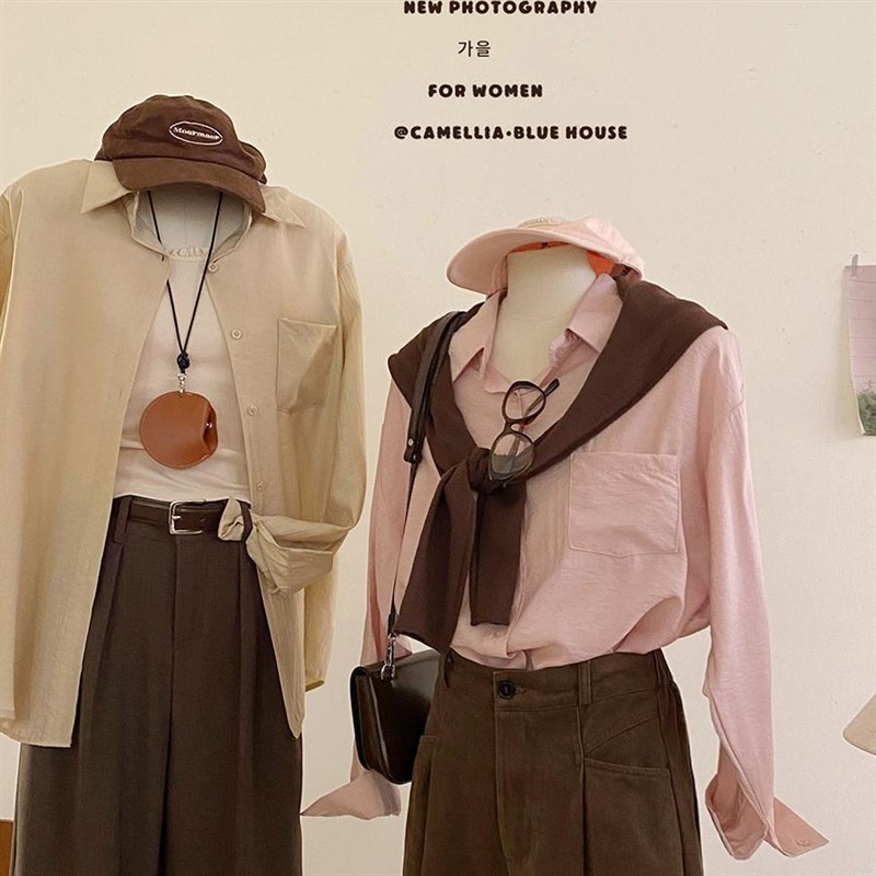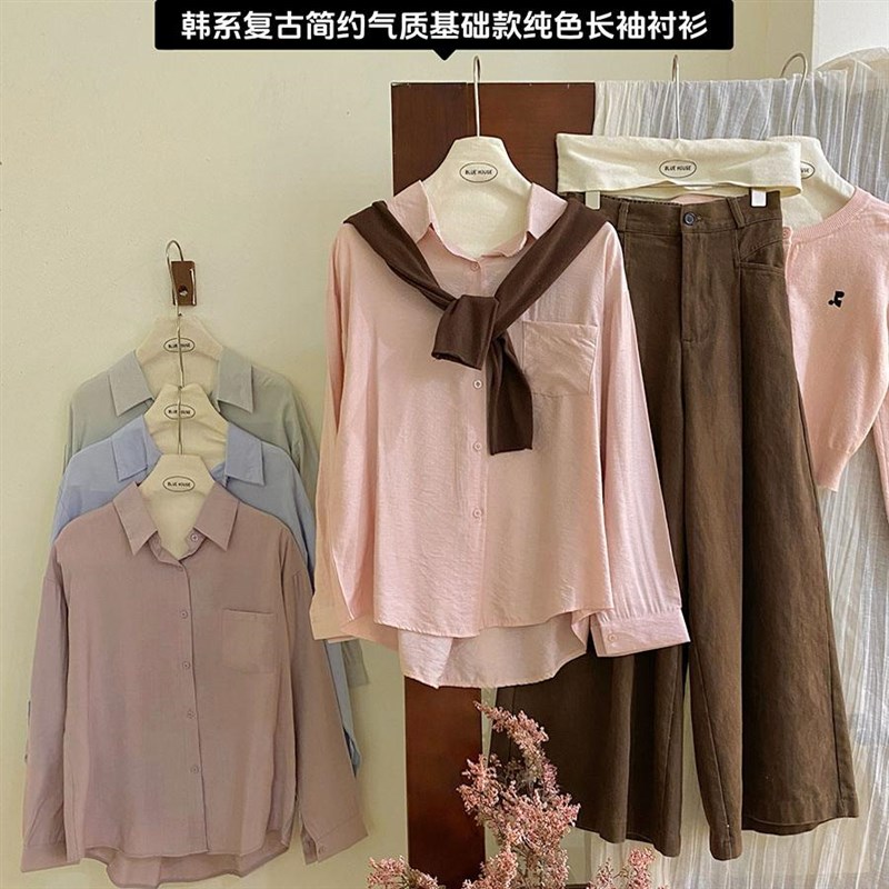 韩国棉温柔气质粉色长袖翻领净版衬衫女春内搭外叠穿宽松休闲衬衣