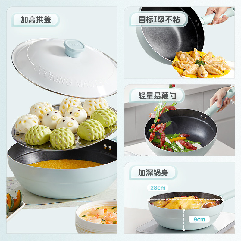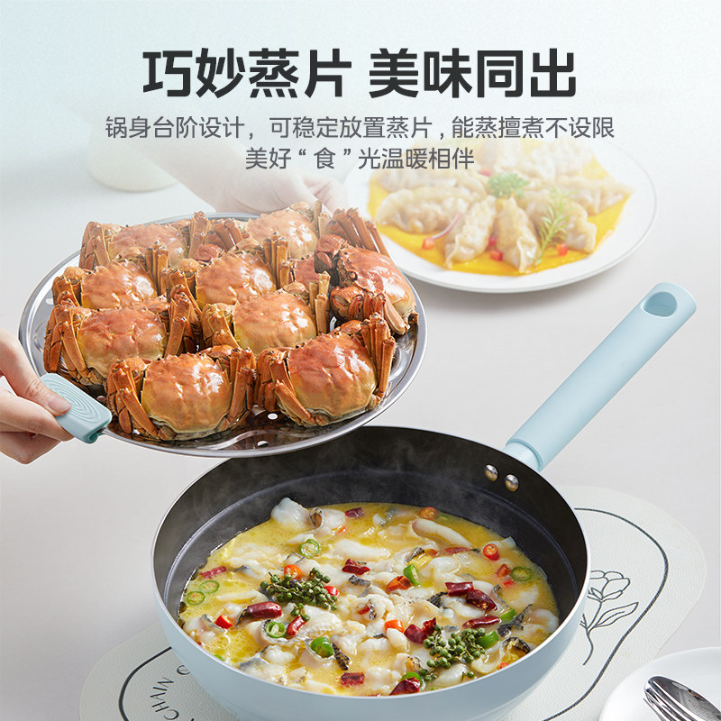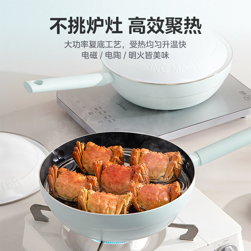 美的不粘锅炒菜锅家用轻巧元气奶芙锅轻油少烟带蒸片官方旗舰正品