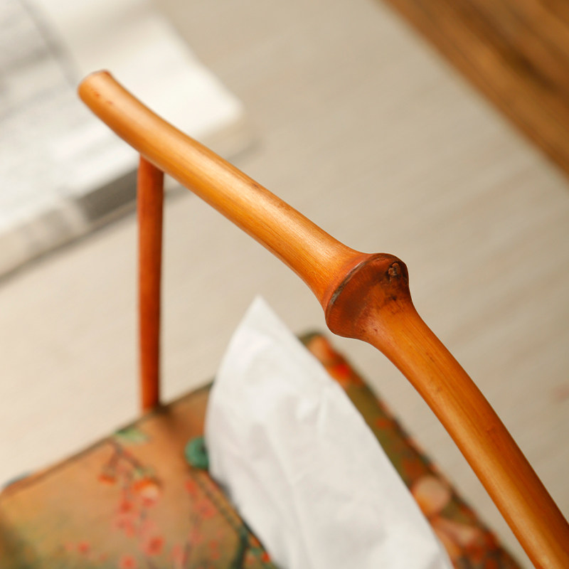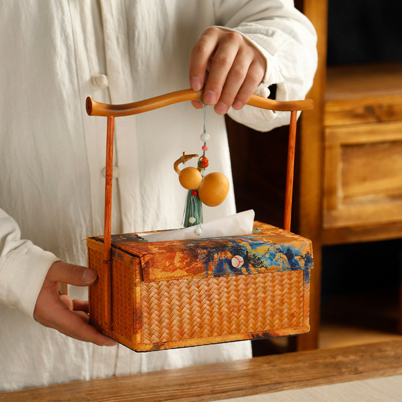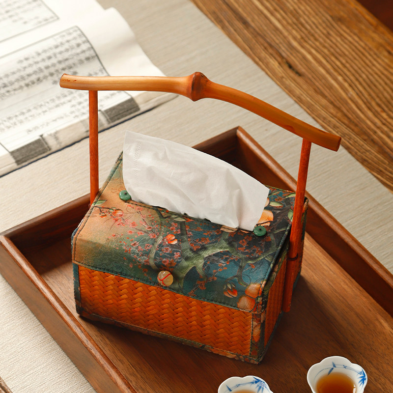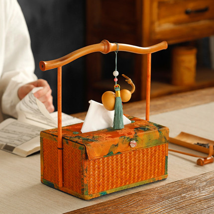新中式复古竹编锦缎纸巾盒筇竹手提抽纸盒客厅家用茶台桌面收纳盒