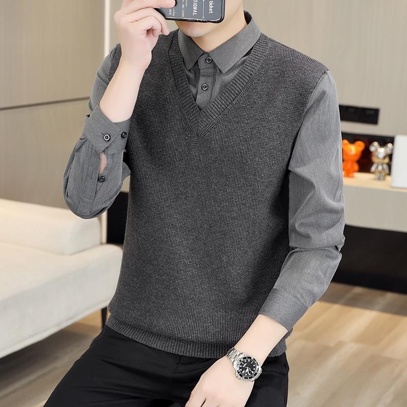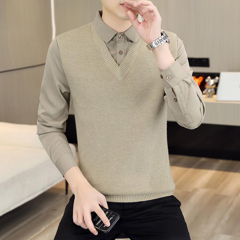 男士假两件毛衣秋2025新款商务休闲男装衬衫领针织衫上衣内1010r