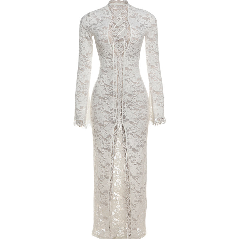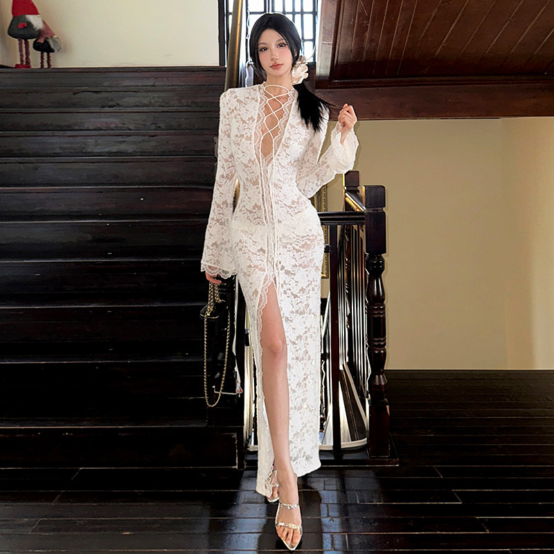 古典风包臀裙蕾丝透视绑带镂空