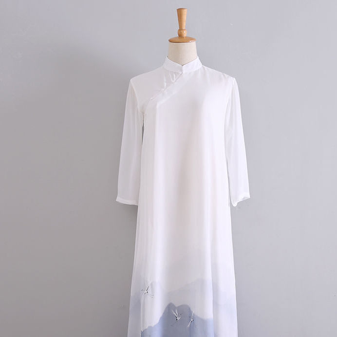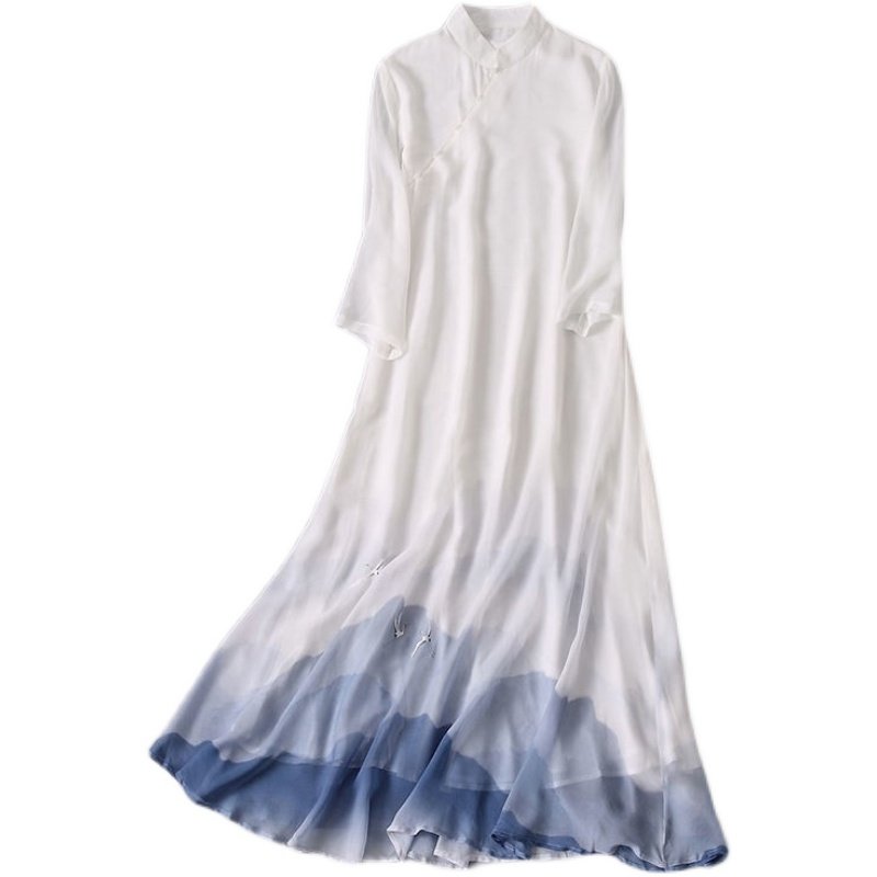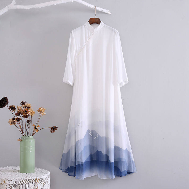2024年中国风复古女装山水画印花新式汉服改良旗袍连衣裙禅意茶服