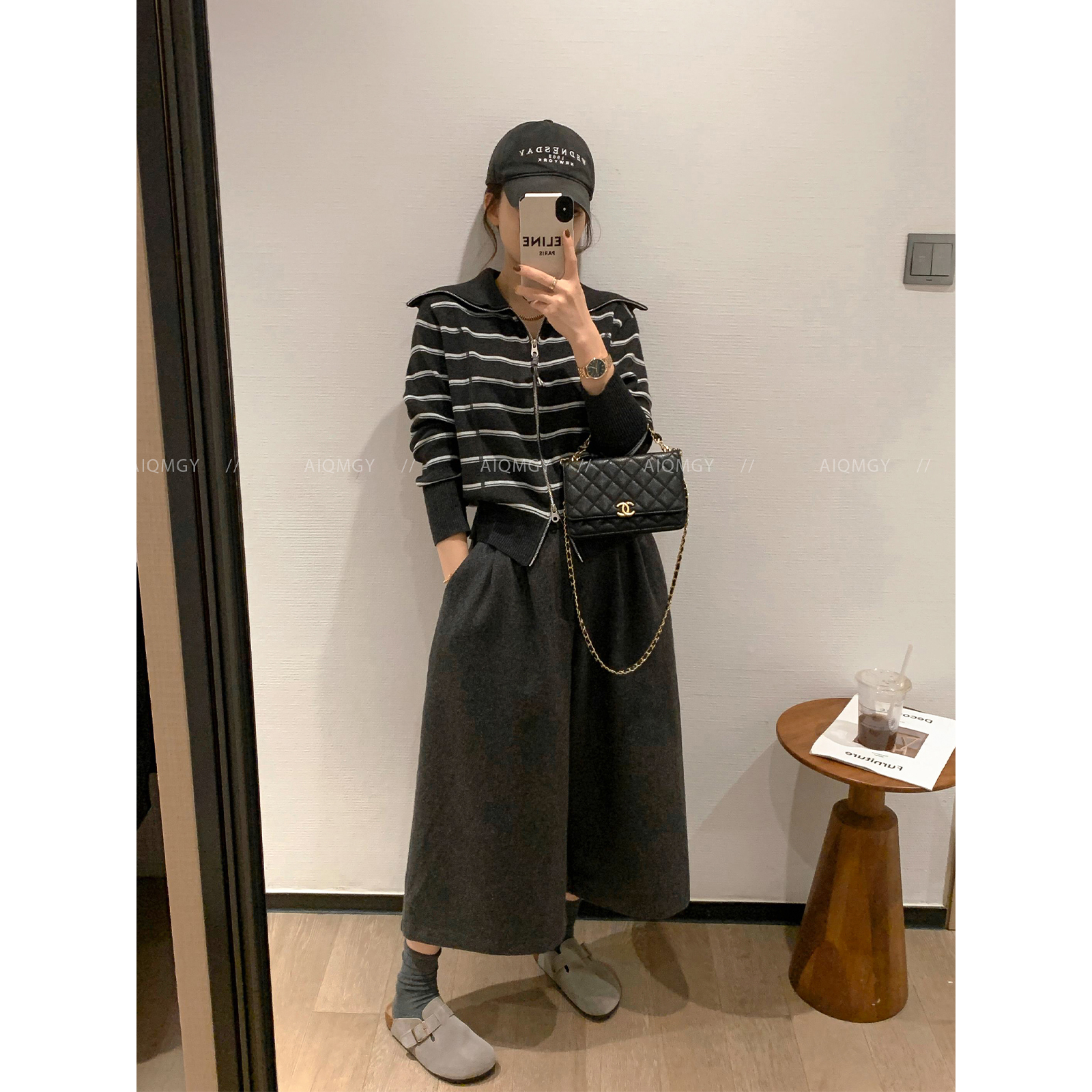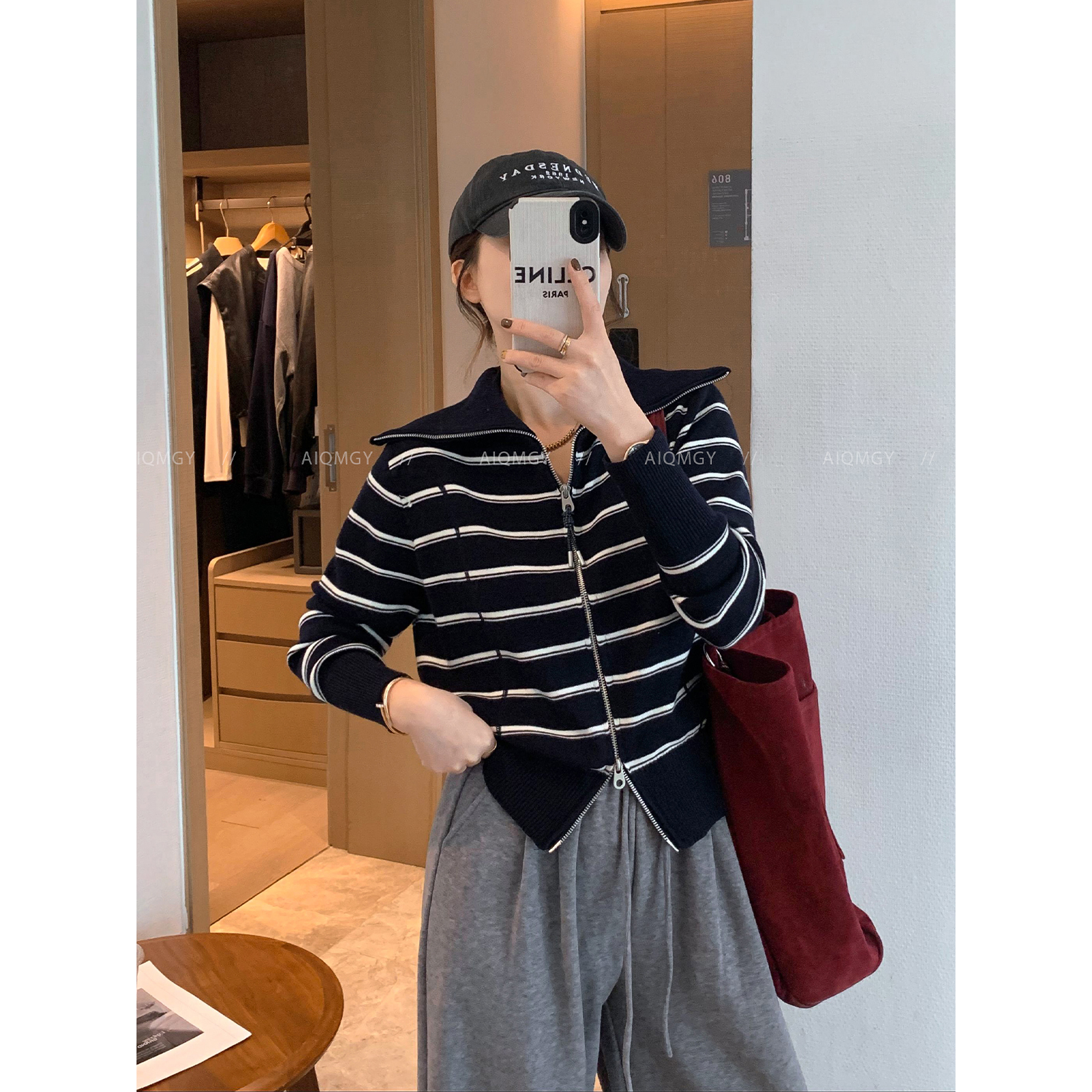 爱情魔鬼鱼 条纹复古双拉链针织开衫女2025秋季新款翻领长袖上衣