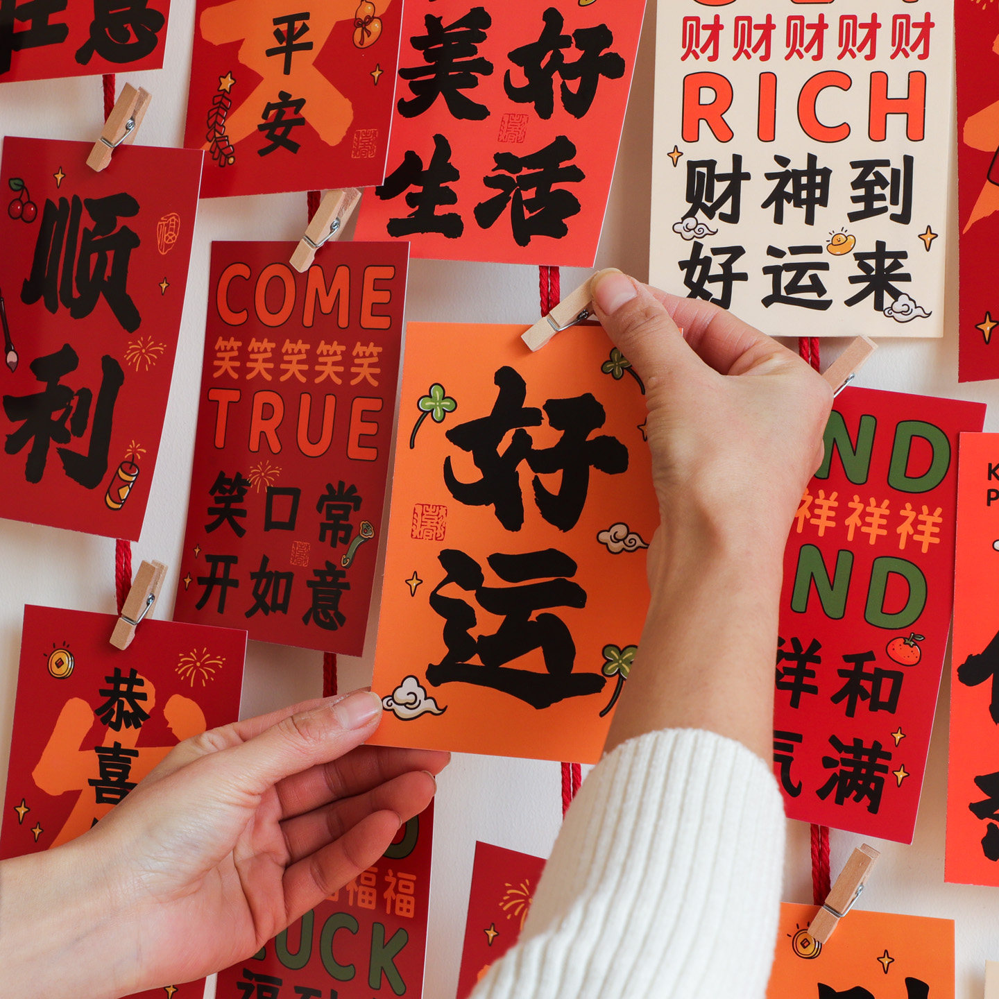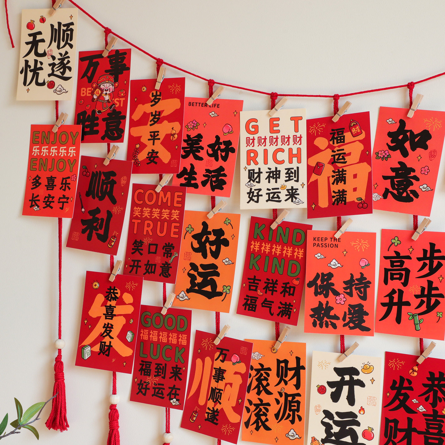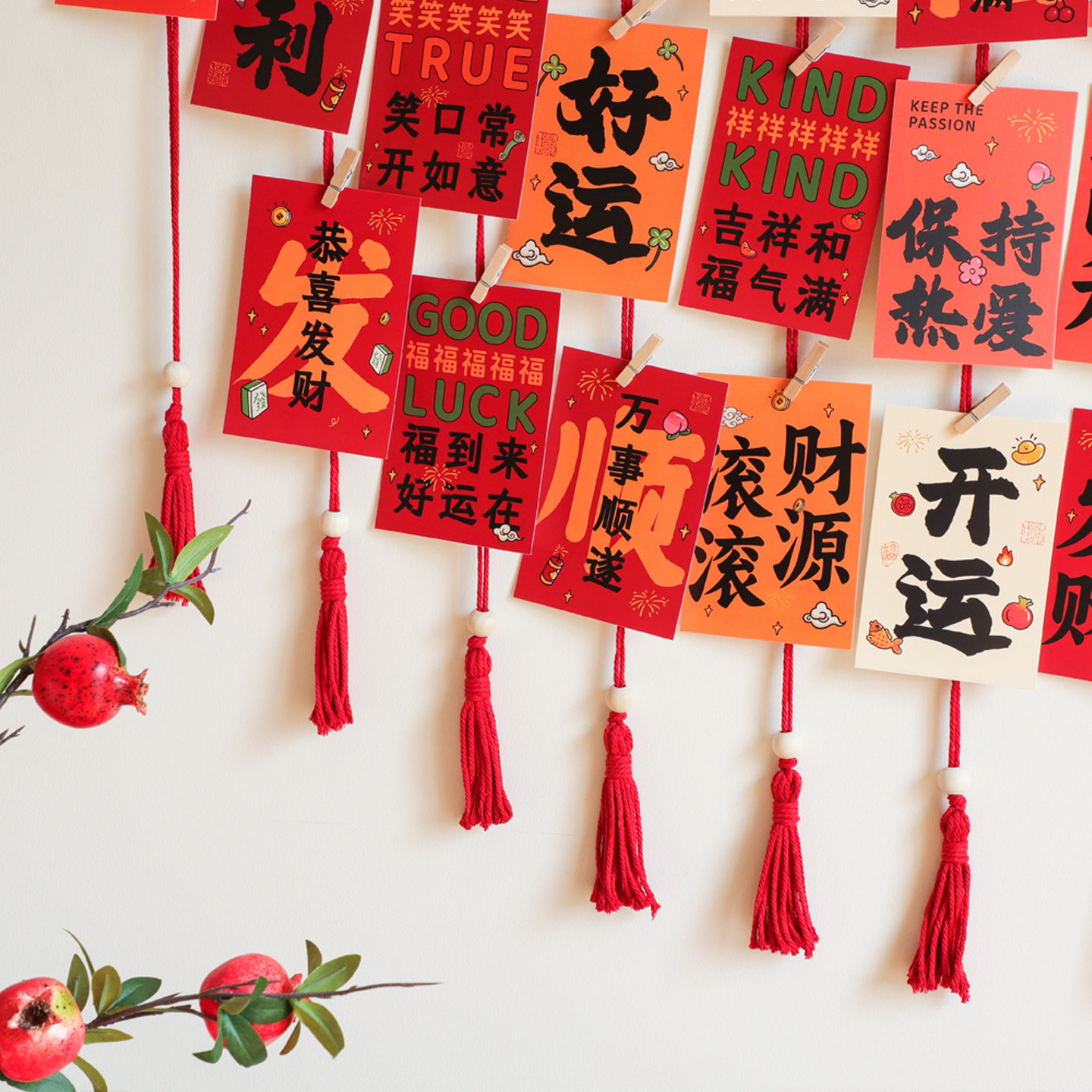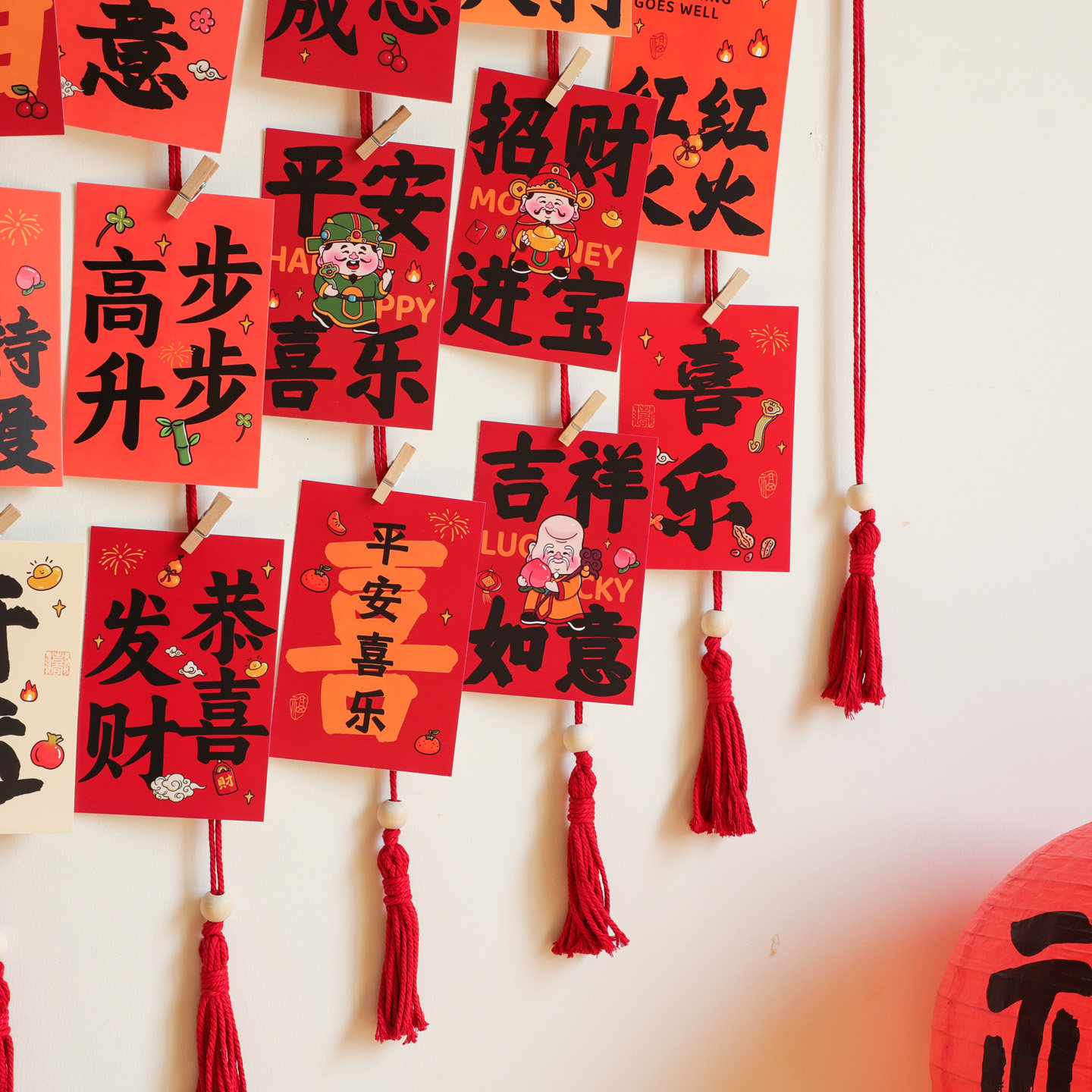 红色喜庆祝福卡片展示挂件创意流苏挂毯壁饰照片收纳展示店铺布置