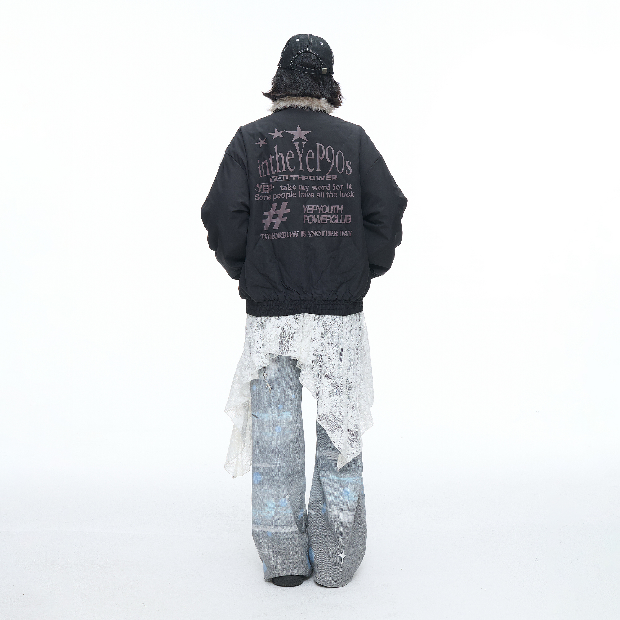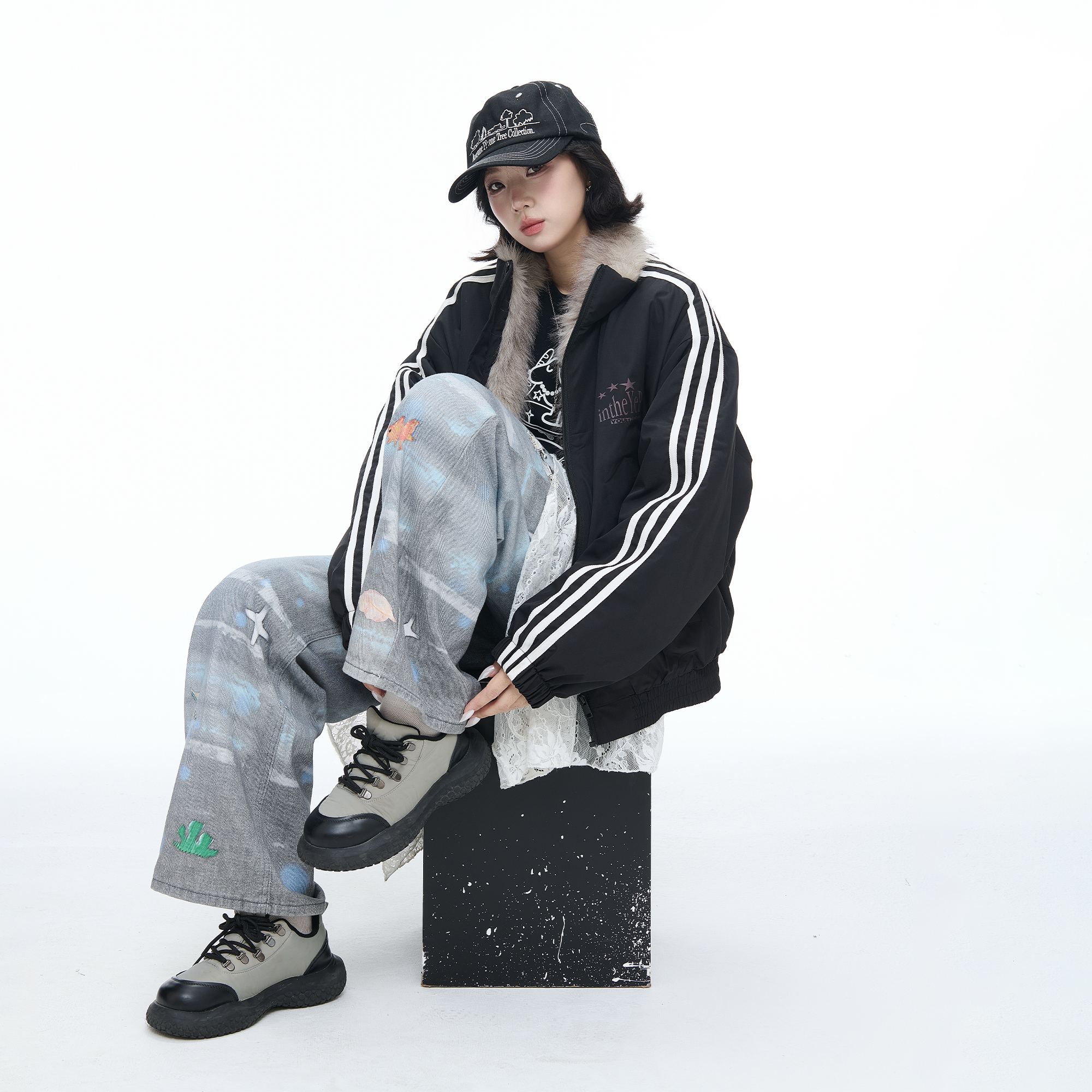 美式复古座山雕条纹拼接印花毛领棉服女冬季新款保暖情侣款面包服
